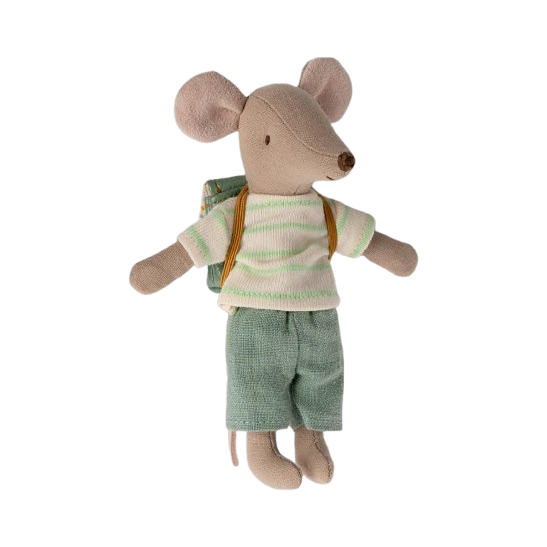 Storebror mus fra Maileg er klædt på til nye eventyr med sin lille rygsæk og praktiske tøjstil. Han har magneter i hænderne, så han kan holde fast i tilbehør – som f.eks. cykelstyr, redskaber eller andet fra museuniverset.