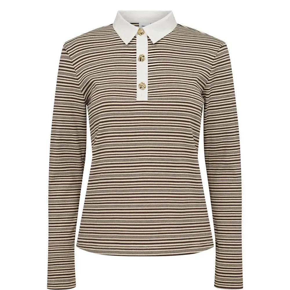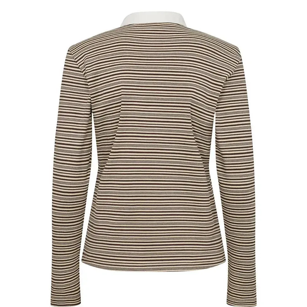 Nusemma LS Polo fra Nümph er en langærmet ribpolo i stribet brun og beige med klassisk hvid krave og stolpelukning med fine knapper. Den smalle silhuet og det elastiske materiale skaber et feminint, komfortabelt udtryk.