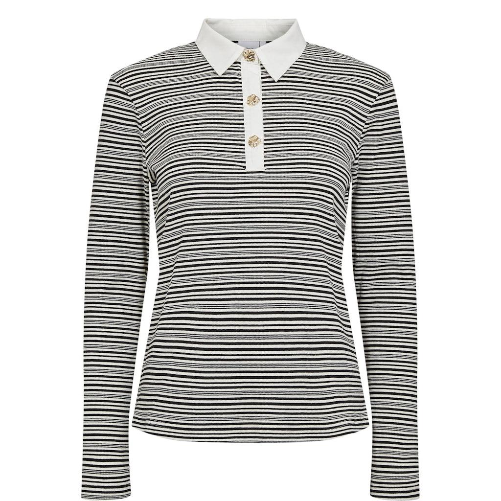 Nusemma LS Polo fra Nümph er en langærmet ribpolo i stribet sort og beige med klassisk hvid krave og stolpelukning med fine knapper. Den smalle silhuet og det elastiske materiale skaber et feminint, komfortabelt udtryk.