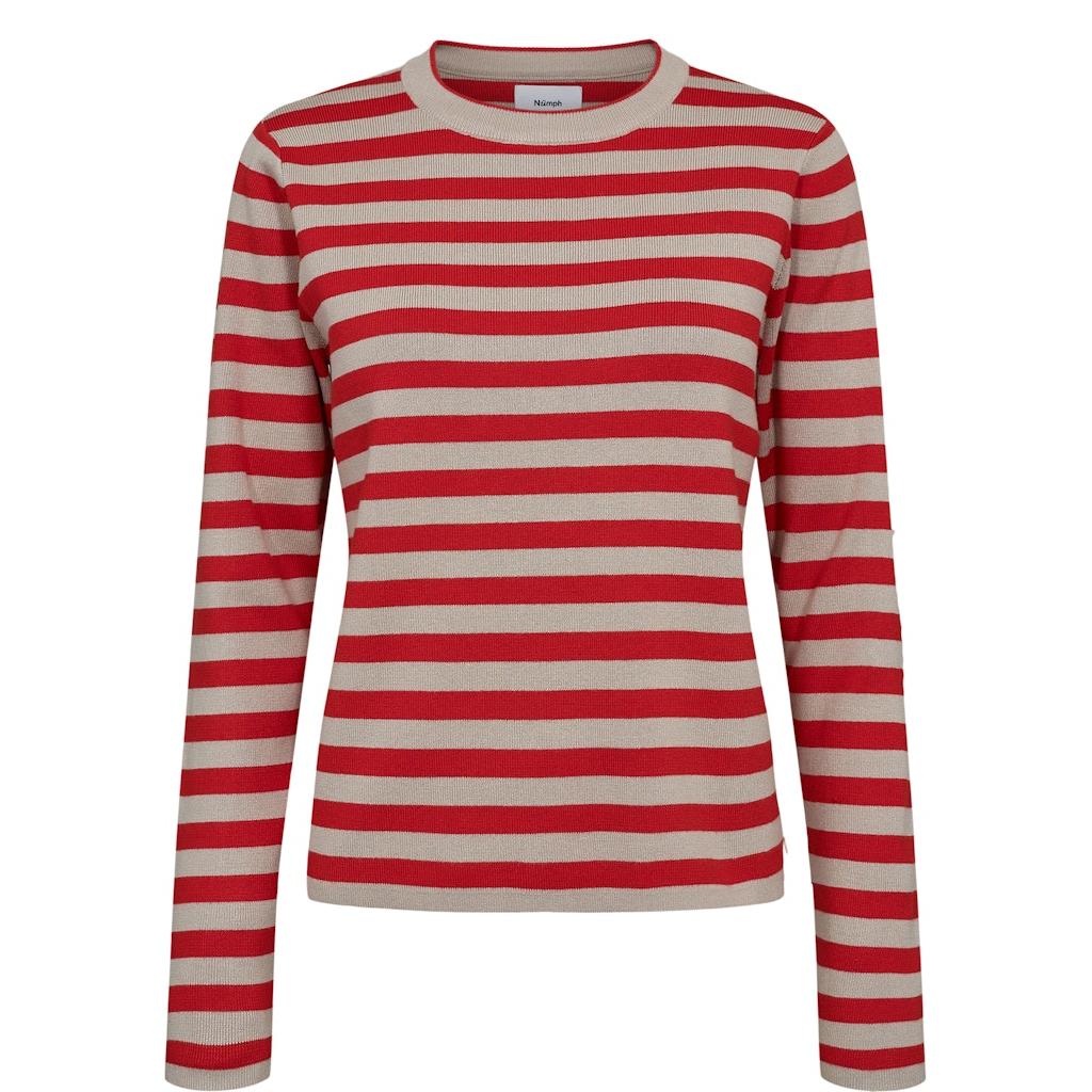 Nustripy Pullover fra Nümph er en strik i røde og lyse striber, der giver et friskt og energisk udtryk. Den er perfekt til at tilføje farve til garderoben og kan nemt styles til både hverdag og weekend.