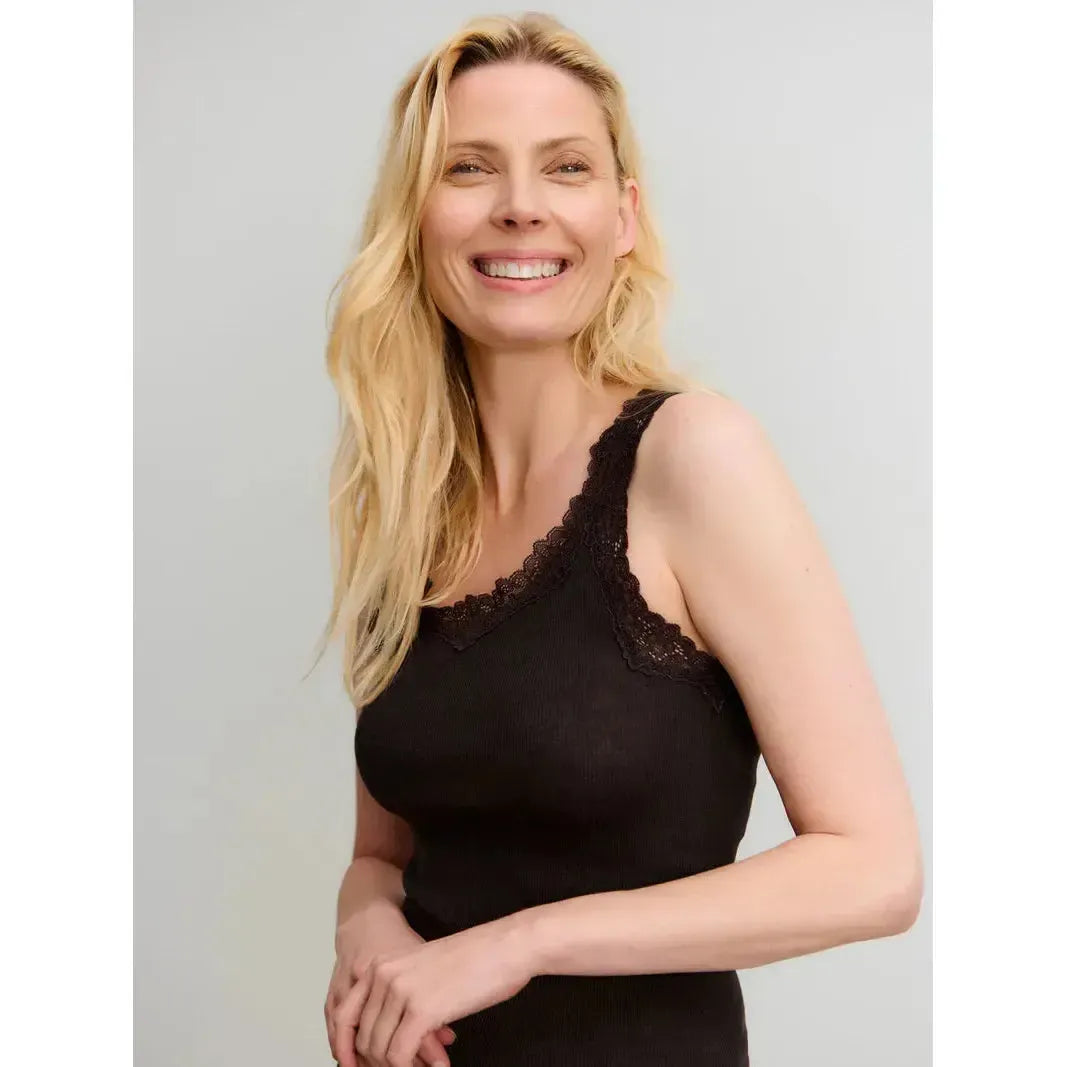 RWBurlington Wool SL Lace Top fra Rosemunde er en ærmeløs top i blød uldblanding med et feminint og klassisk udtryk. Den har en tætsiddende pasform og er afsluttet med en fin blondekant, der giver et elegant præg.