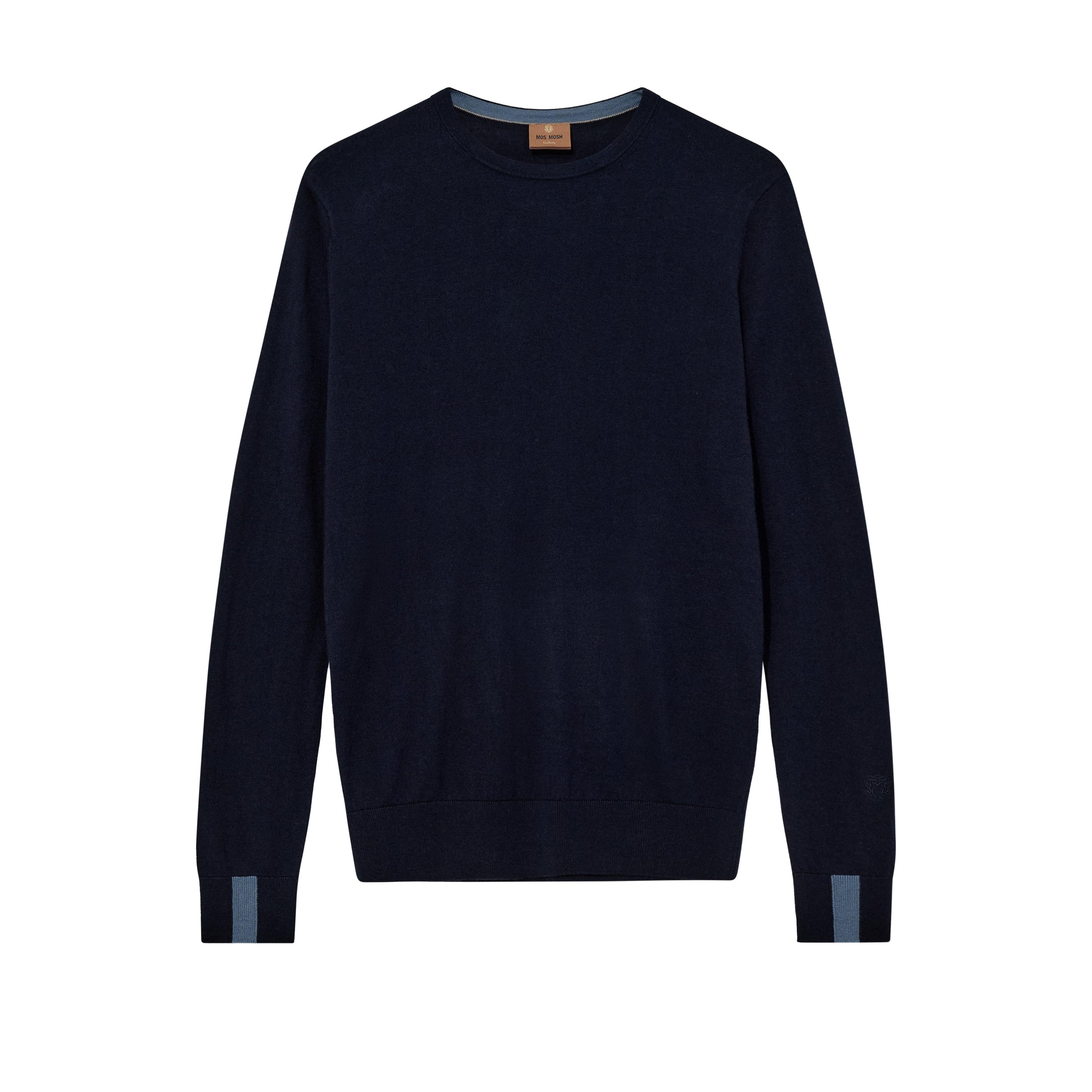 Strikken er fremstillet i en blød og let kvalitet, der føles behagelig mod huden. Den har rund hals, ribkanter og en almindelig pasform, som giver et afslappet, men velklædt udtryk.