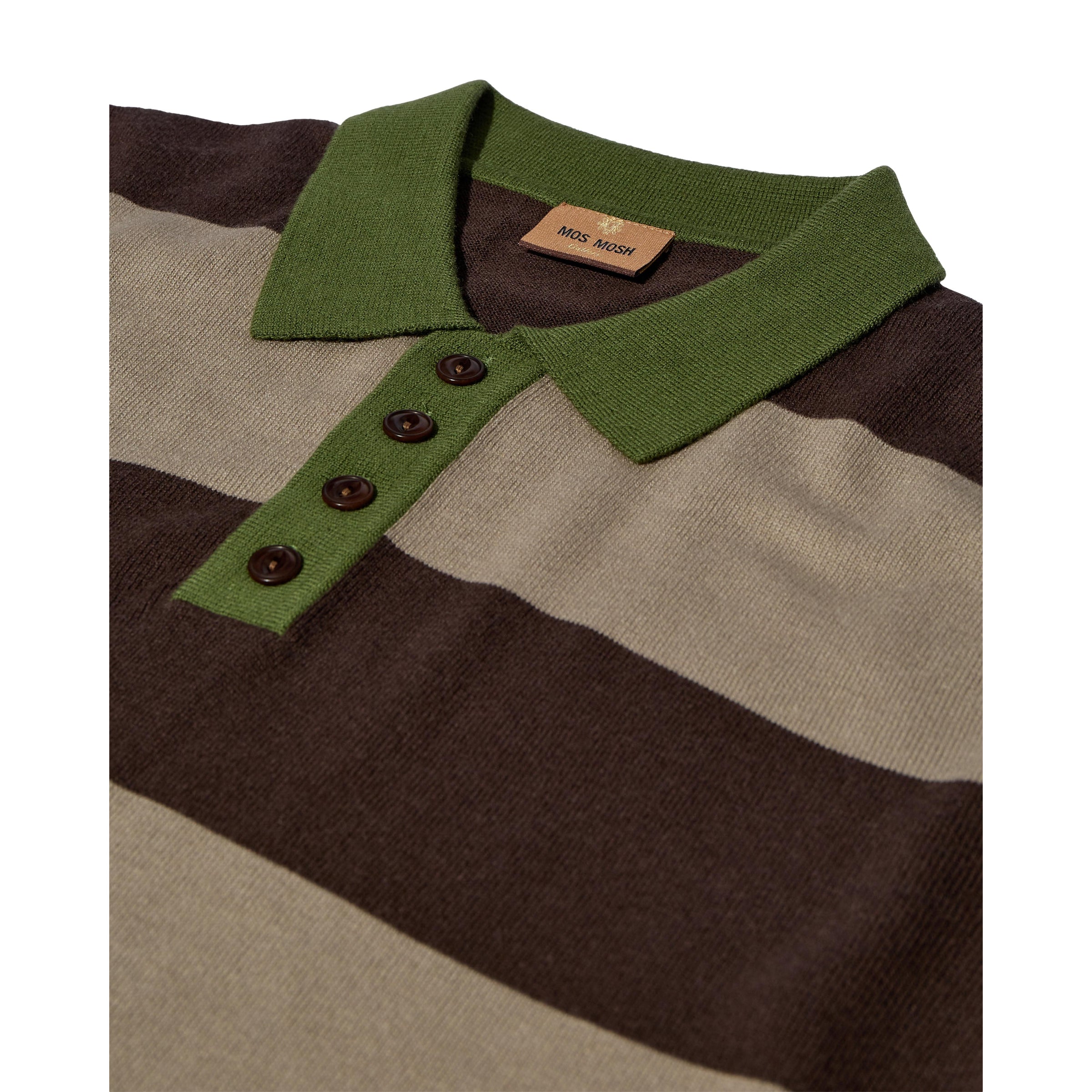 MMGRoyal Preppy LS Polo Knit fra Mos Mosh Gallery er en langærmet striktrøje med tydelig inspiration fra den klassiske rugbytrøje. De brede striber i chokoladebrun og beige giver et afslappet, grafisk udtryk – mens den grønne krave tilfører et moderne twist.