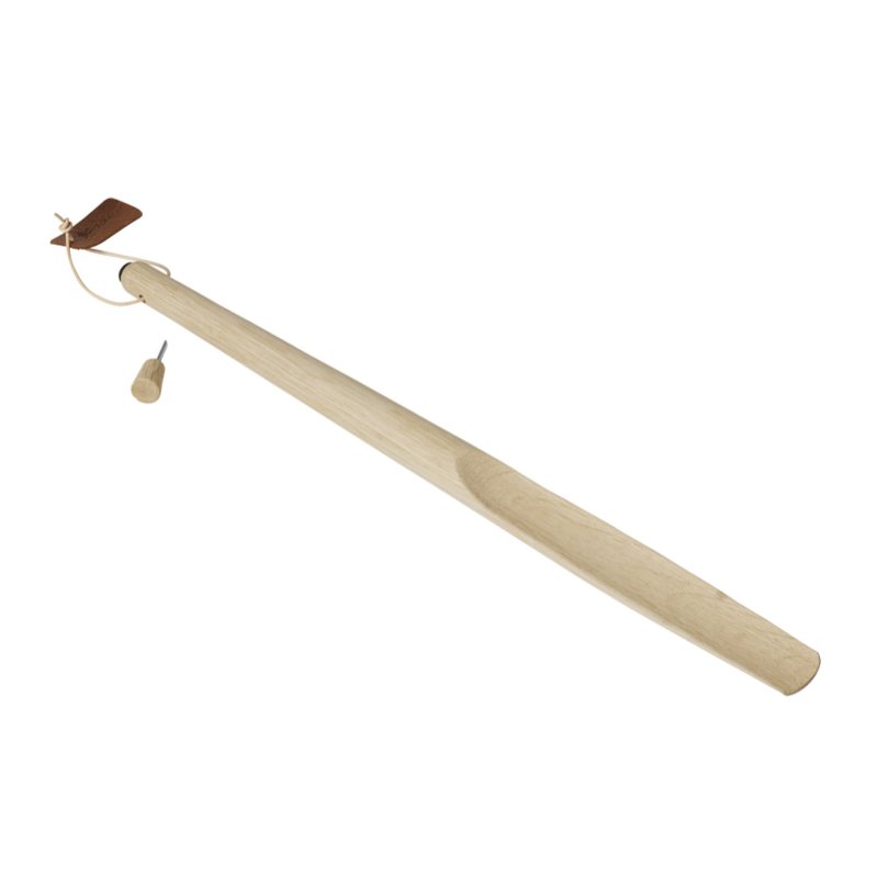Skohornet har en integreret knag i toppen, som gør det let at hænge op, når det ikke er i brug. Det er fremstillet i massivt træ og har en glat, behagelig overflade, der ligger godt i hånden. Det håndværksmæssige udtryk og de smukke træsorter gør det til mere end blot et redskab – det er en detalje, der løfter entreen.