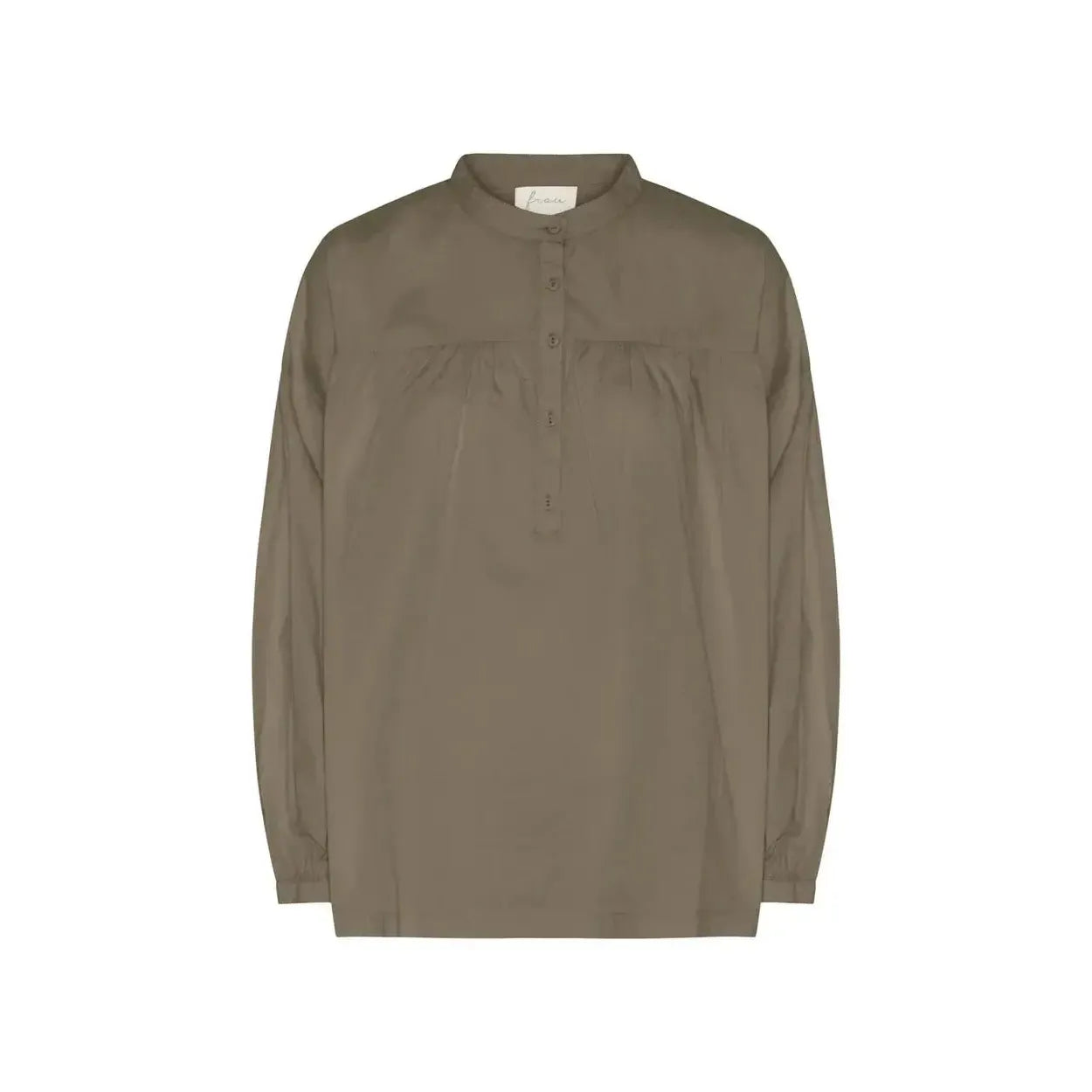 Paris Is Shirt fra Frau er en let og rummelig skjorte med lange ærmer, kinakrave og et feminint snit. Den bløde silhuet får karakter af de rynkede detaljer foran, bagpå og ved manchetterne, som giver et let og levende fald.