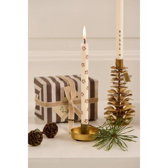 Det hvide lys prydes af små stjerner i brun, som tilfører et enkelt, men effektfuldt præg til borddækningen.