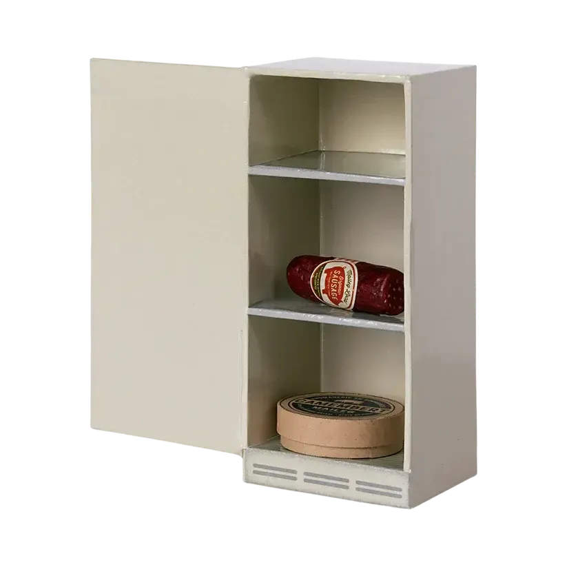 Køleskabet er lavet i pap og har en dør, der kan åbnes og lukkes. Indeni gemmer sig små madvarer – en pølse og et stykke ost i polyresin – klar til at blive brugt i musefamiliens køkken.