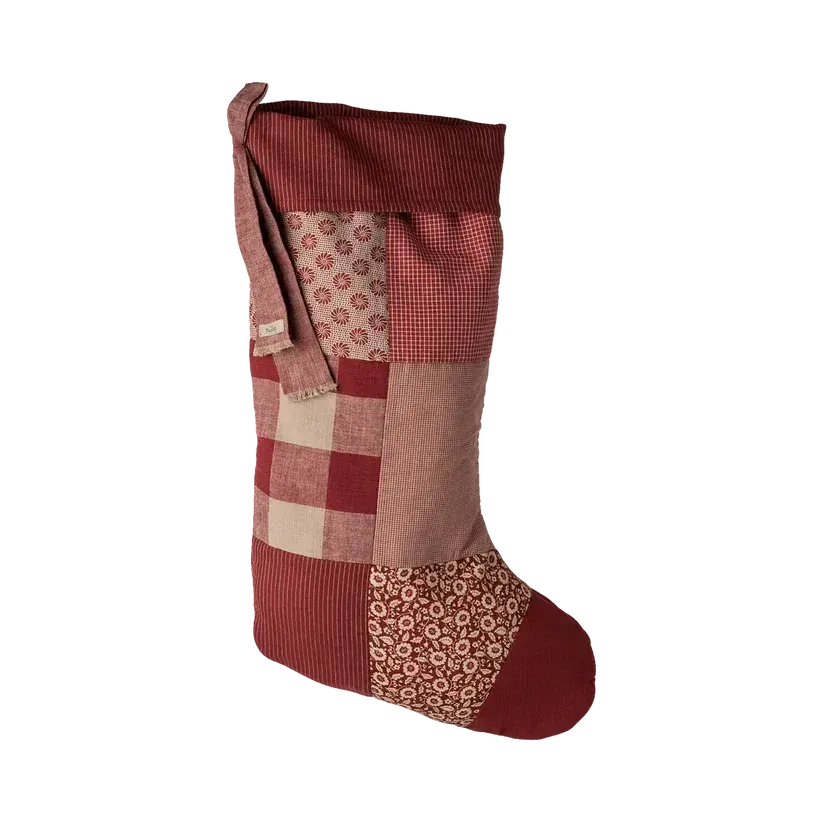 Denne smukke julestrømpe fra Maileg er dekoreret med et mønster af blomster og lavet i en mosaik af forskellige stoffer i julens farver. Den skaber et varmt og nostalgisk udtryk i hjemmet.