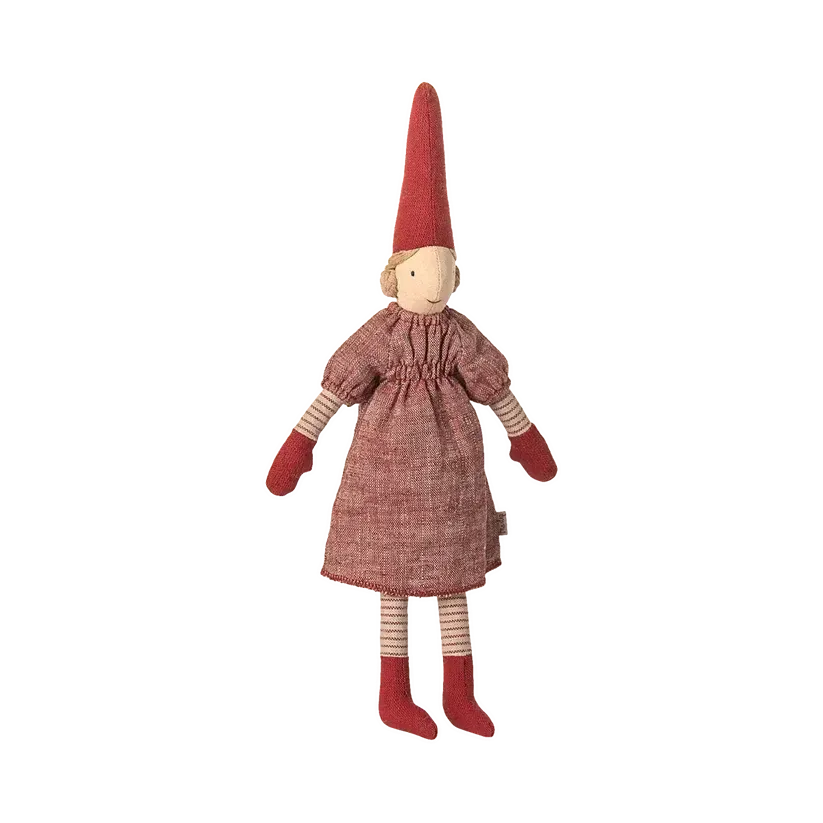 Denne nissepige i størrelse 2 fra Maileg er en del af den charmerende nissekollektion. Hun er klædt i en klassisk rød kjole, der giver et tidløst og hyggeligt udtryk i julepynten.