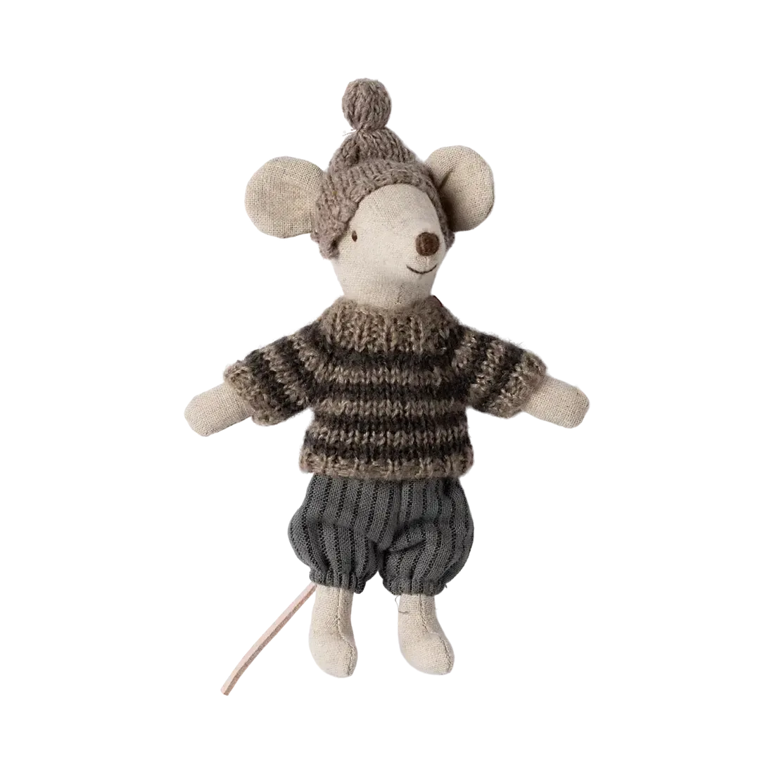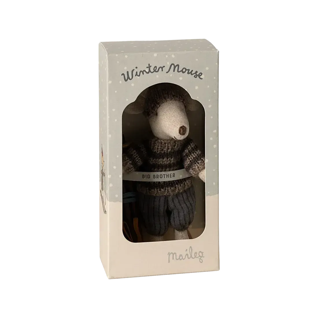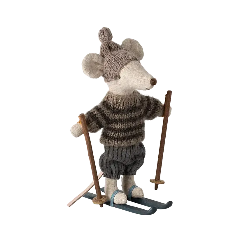 Storbror mus er både en del af Mailegs legende univers og en dekorativ figur til vintersæsonen. Hans tøj er syet med fine detaljer, og ski og stave kan tages af og på, så han kan både stå på ski og være klar til kram.