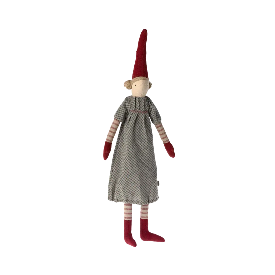Denne Pixy-nisse fra Maileg er iført en smuk blå kjole i bløde tekstiler og er en del af en klassisk julekollektion i størrelse 3. Med sit rolige udtryk og fine detaljer bringer hun julestemning ind i både moderne og nostalgiske hjem.