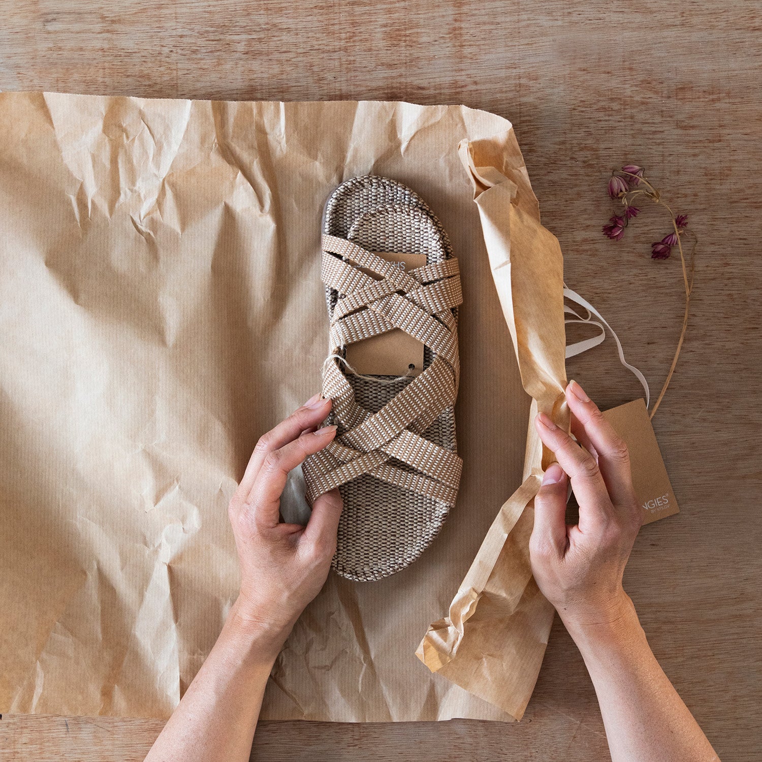 • Materiale: Jutesål og stropper i tekstil, ydersål i genanvendeligt EVA