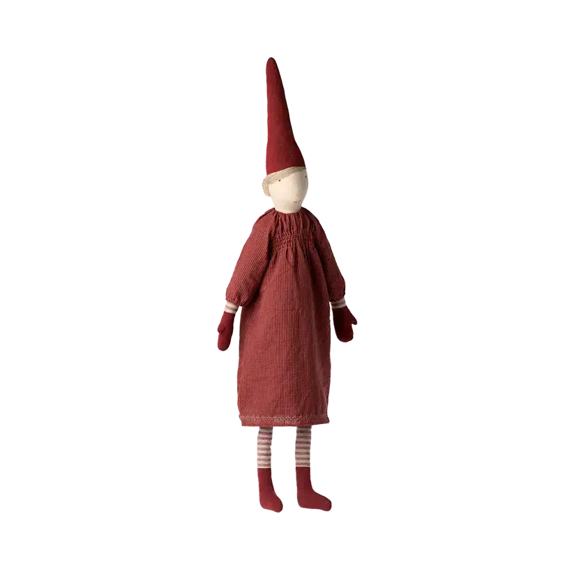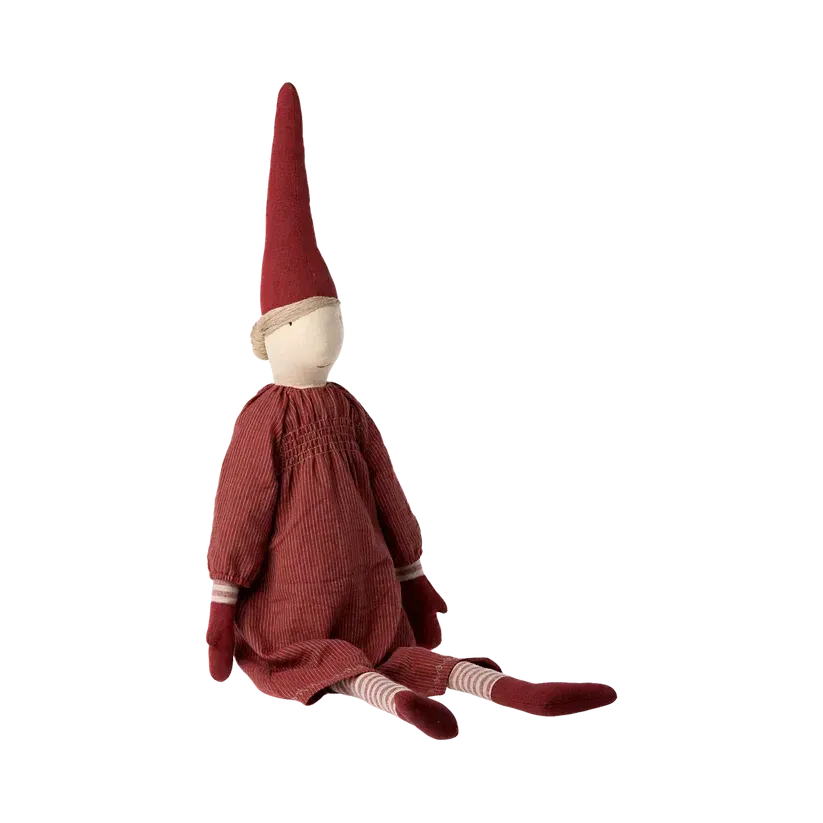 Mega Pixy‑pigen er kun til pynt og træder virkelig frem i store rum, ved indgangspartier eller som del af en Maileg‑samling. Hun giver julepynten både højde og nærvær.