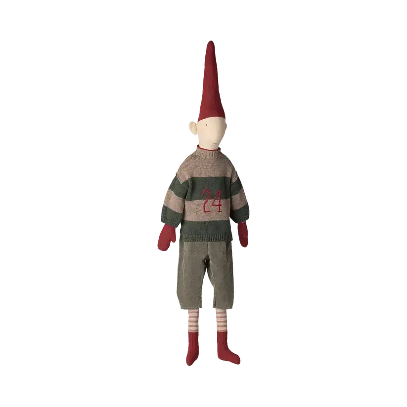 Denne nissedreng i størrelse 6 fra Maileg er en del af den elskede nissekollektion. Han er iført en varm strikket sweater, der giver et klassisk og hyggeligt udtryk – perfekt til julens stemningsfulde dekorationer.