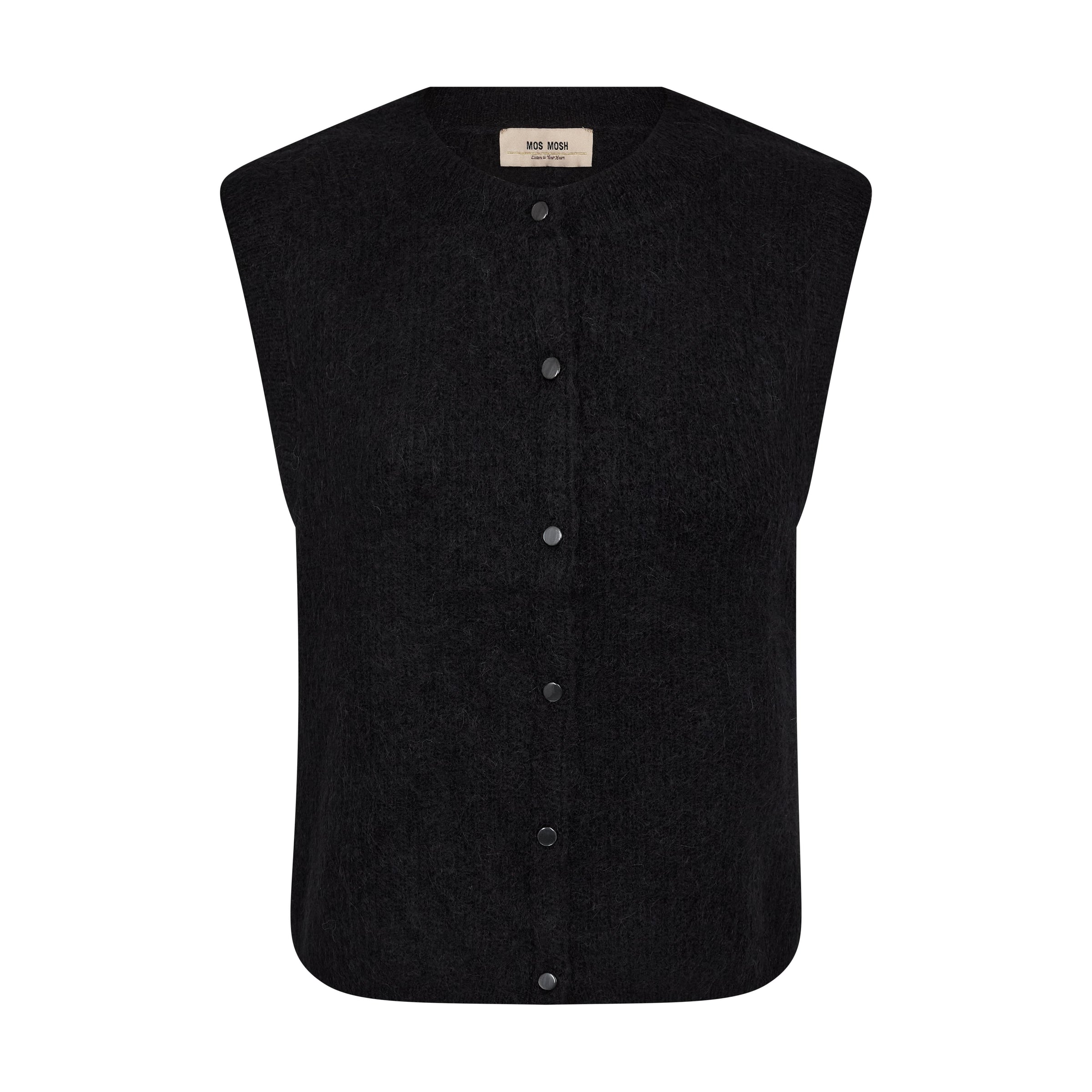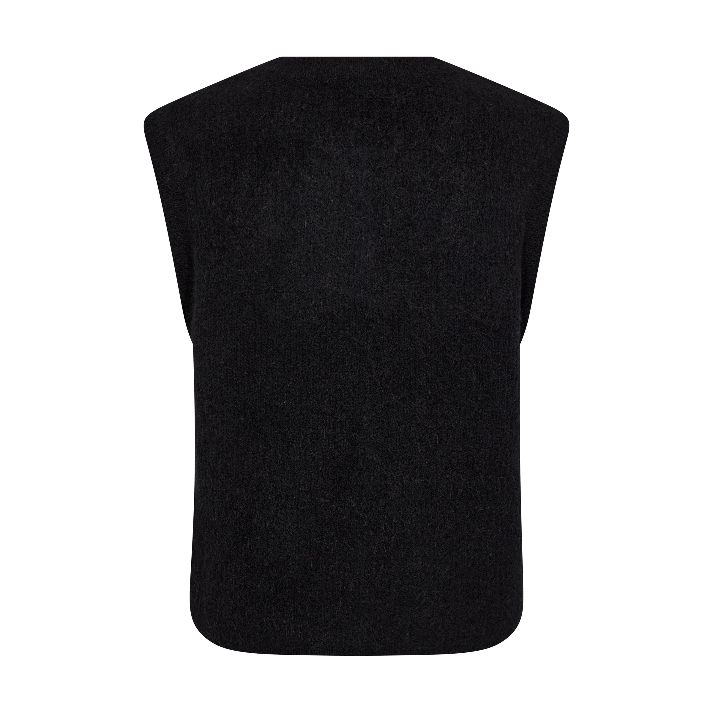 Almine Thora Knit Vest fra Mos Mosh er en blød strikvest i farven sort – en nuance, der giver et naturligt og roligt udtryk. Den er enkel i designet og nem at style både alene eller som lag over skjorter og bluser.