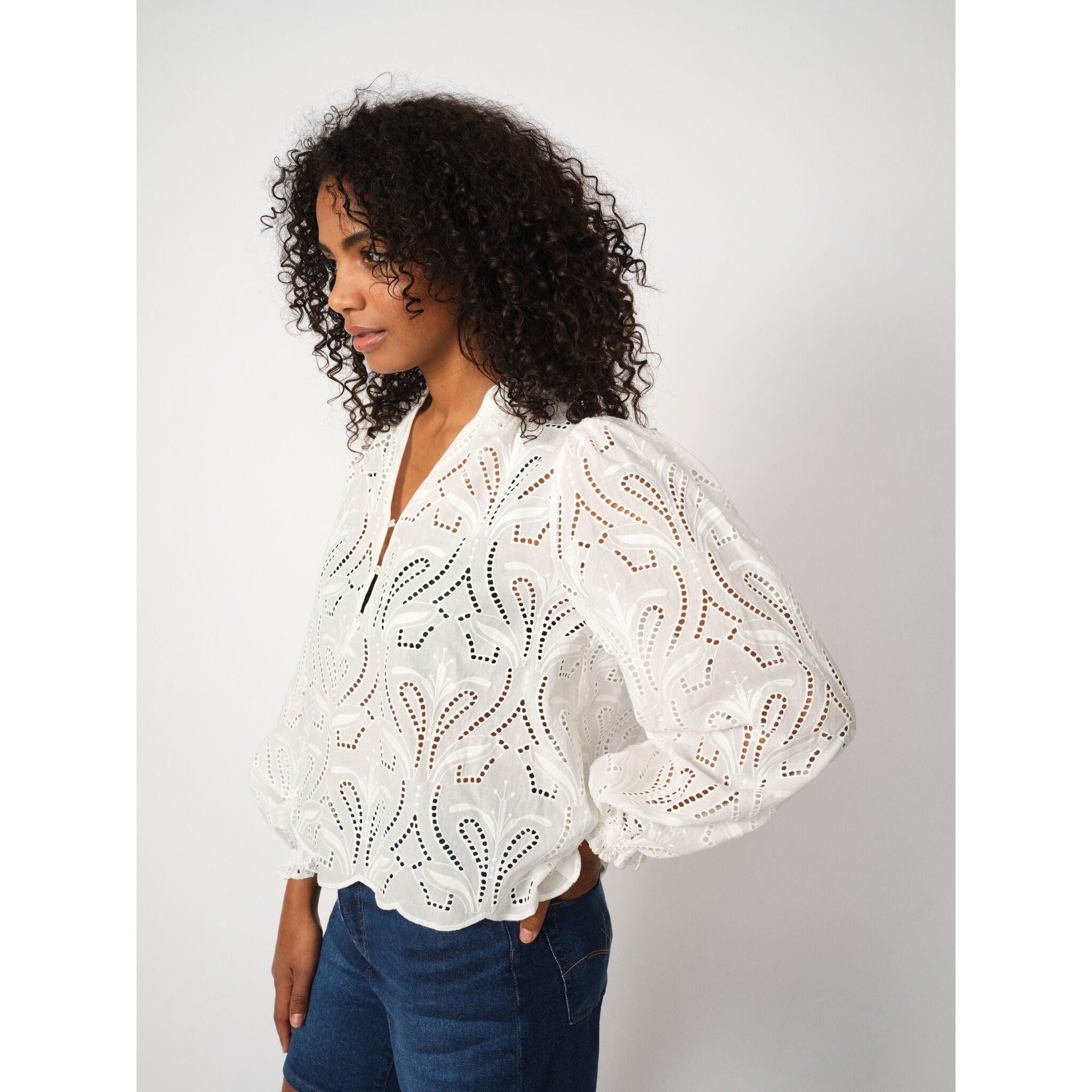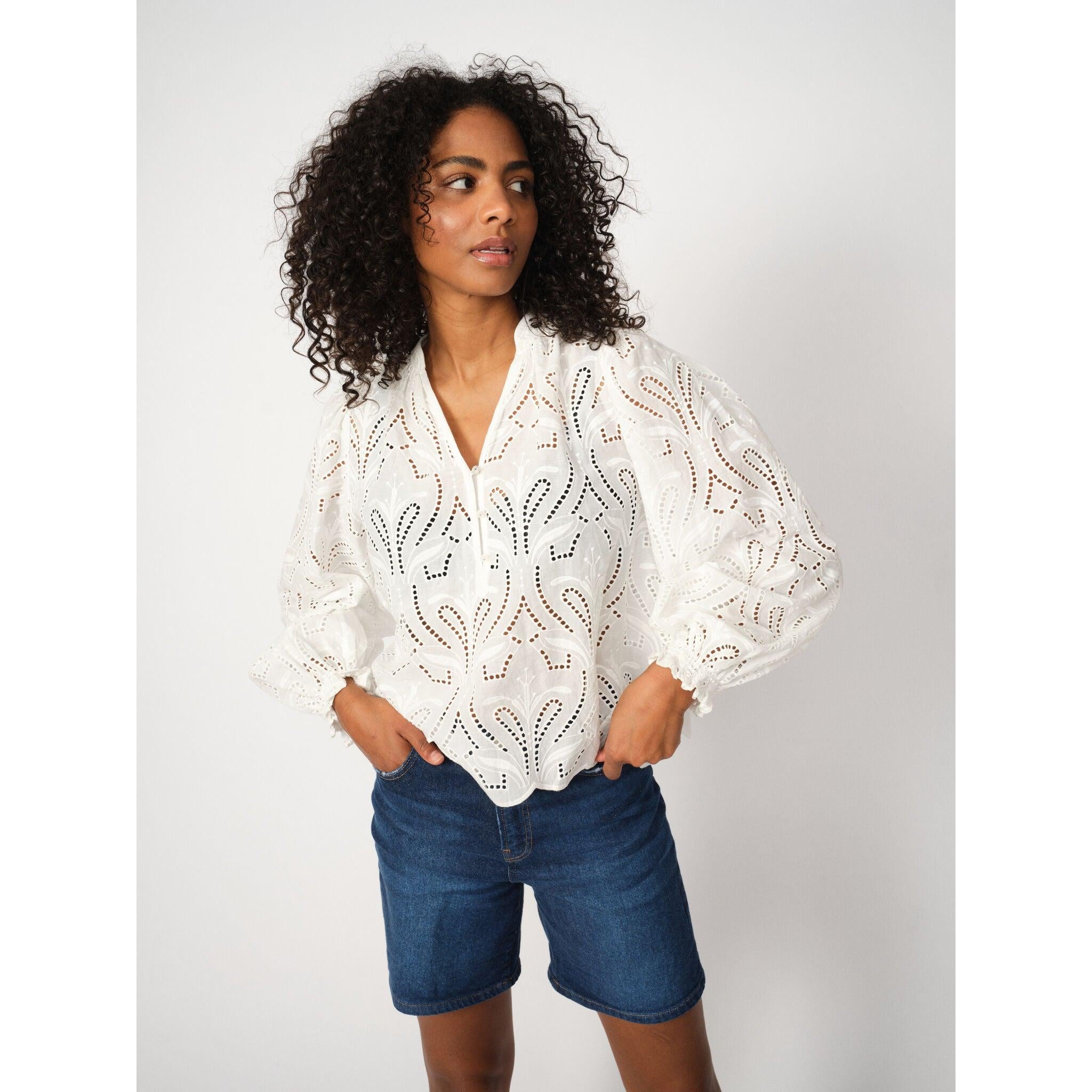 Små slid-effekter og opsmøg ved benene giver et feminint og råt touch til den klassiske denimstil.