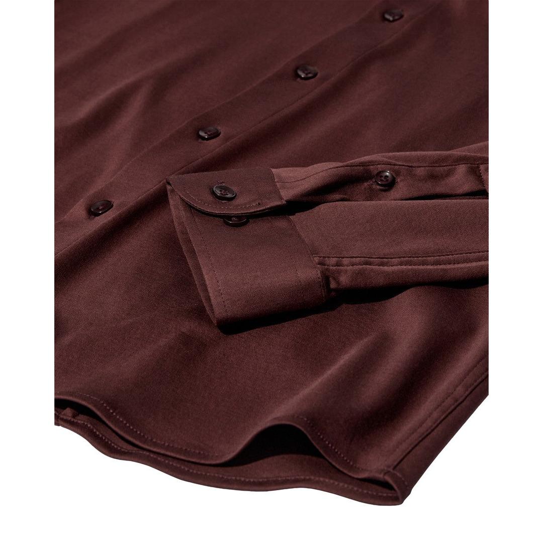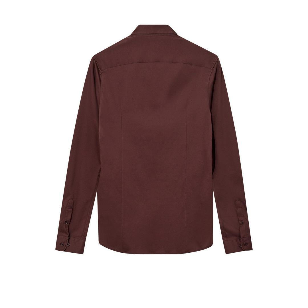 Skjorten har krave, knaplukning og manchetter, men stoffet giver ekstra bevægelsesfrihed og en afslappet følelse. Pasformen er regular og følger kroppen uden at stramme.