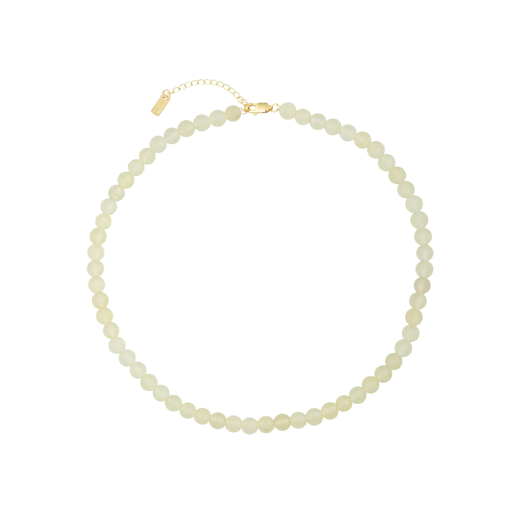 Halskæden er lavet af glas- og naturperler i forskellige former, der giver et legende, men raffineret udtryk. De forgyldte detaljer og den justerbare lukning gør den både eksklusiv og fleksibel i brug.