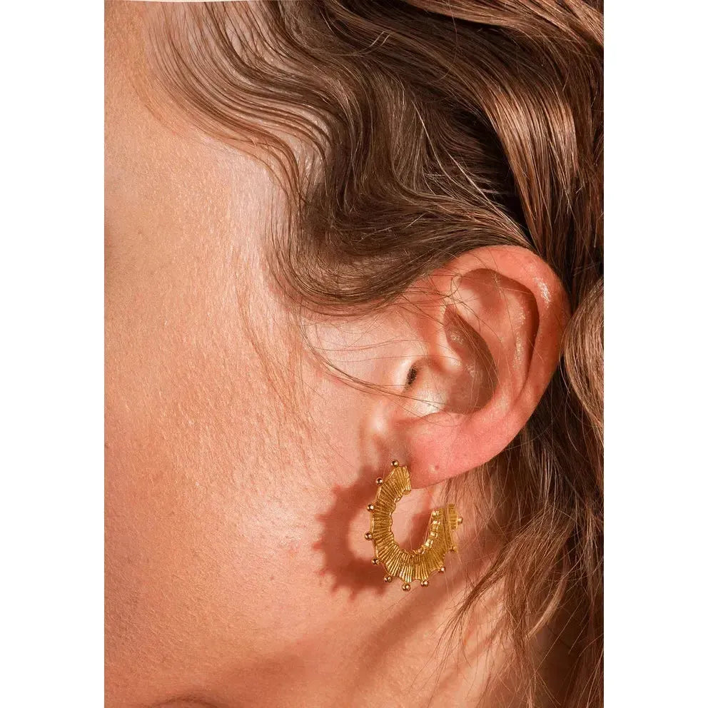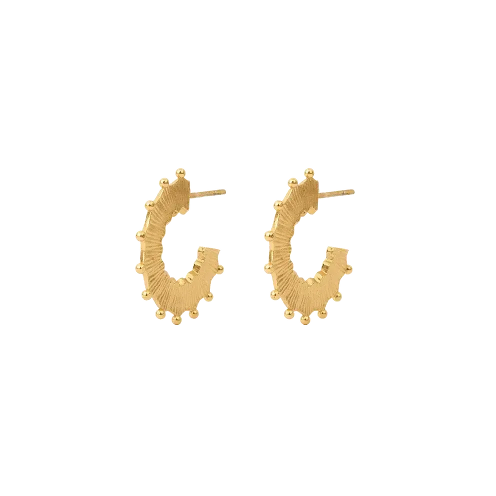 Øreringene er lavet i 100 % genanvendt 925 sterlingsølv og belagt med 18 karat guld. De måler 29 mm i diameter og har en afrundet profil, der fanger lyset smukt. Med klassisk stik-lukning er de både lette at bruge og behagelige at bære.
