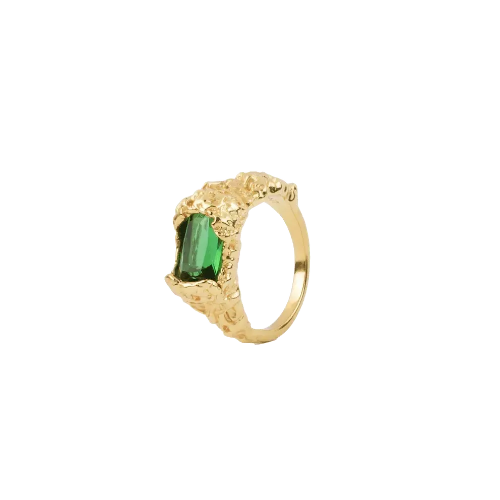 Ringen er lavet i 100 % genanvendt 925 sterlingsølv og belagt med 18 karat guld. Den grønne sten er facetslebet og indrammes af en ru og levende overflade, som giver kontrast til det blanke bånd. Resultatet er både dramatisk og raffineret.