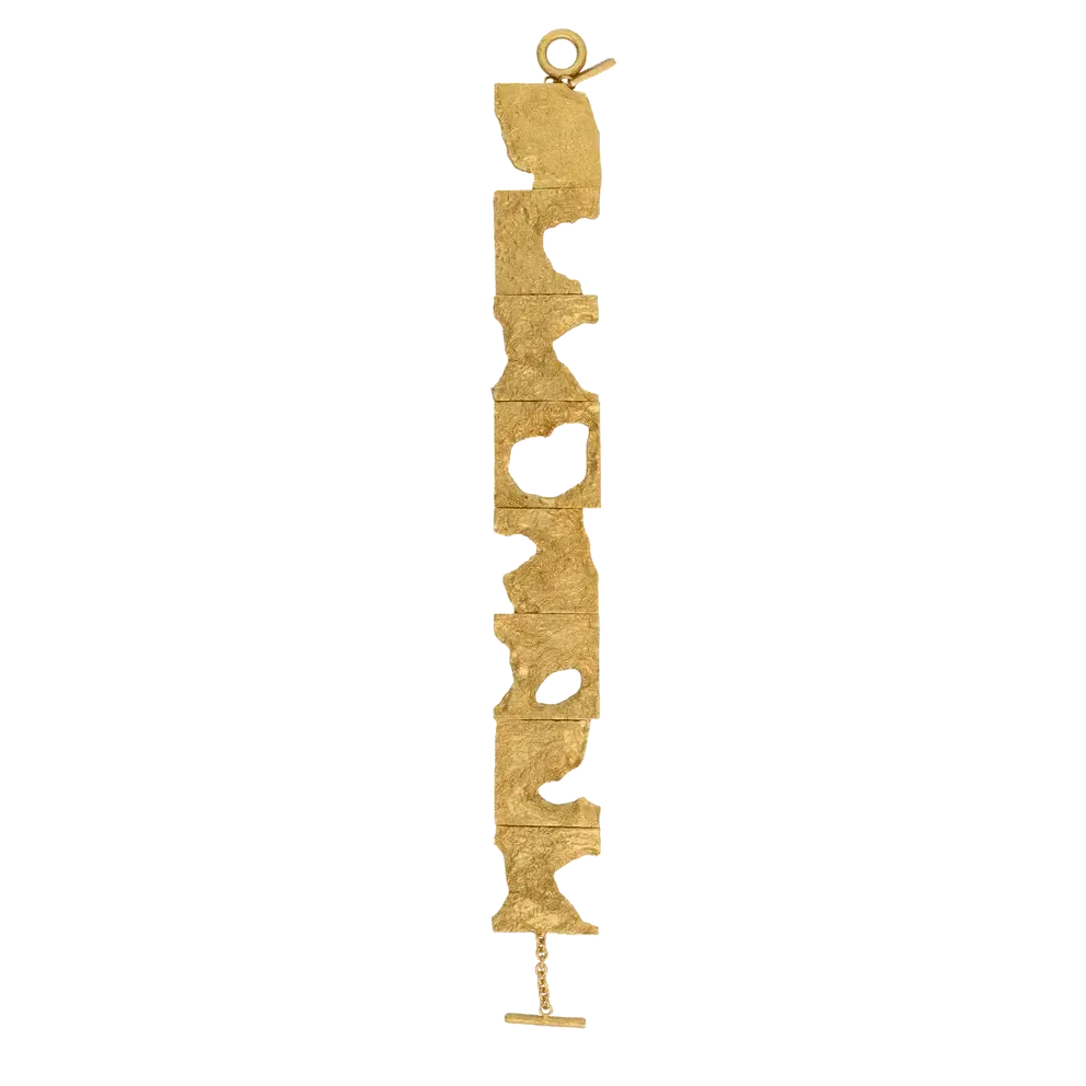 Armbåndet er udført i 100 % genanvendt messing og belagt med 14 karat guld. Det er nikkelfrit, blyfrit og allergivenligt – skabt med omtanke. Længden fås i to størrelser: small (17,5 cm) og medium (19,5 cm), og det lukkes med en dekorativ T-lås.