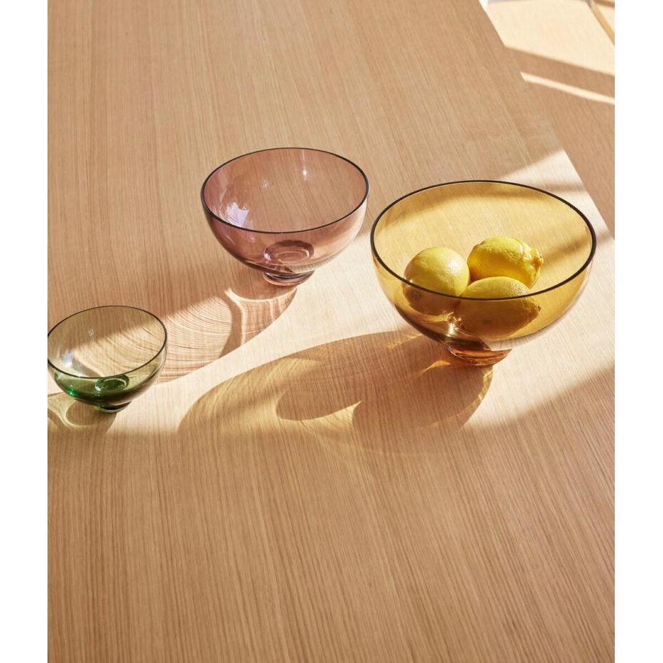 Alle skålene er håndlavede og mundblæste med små luftbobler, som giver hvert stykke sit helt eget udtryk. De er fødevaregodkendte, tåler opvaskemaskine og mikrobølgeovn, hvilket gør dem både smukke og praktiske i brug.