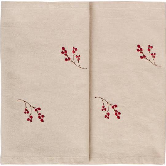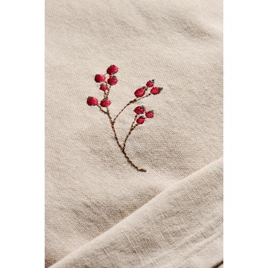 Den hørfarvede bund giver et varmt og afdæmpet udtryk, mens de rødlige bær tilfører et diskret strejf af jul. Bordløberen passer smukt sammen med både lyst og mørkt service og kan bruges gennem hele vinteren.