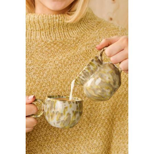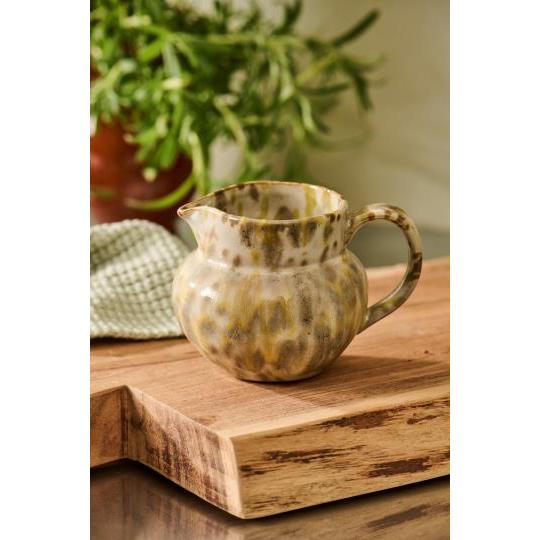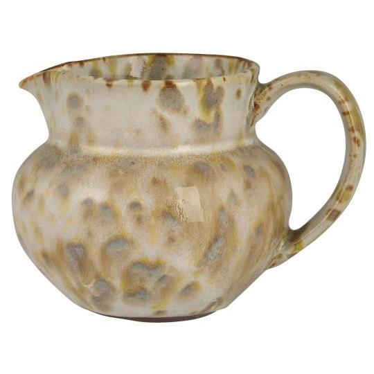 Kanden er lavet i stentøj med reaktiv glasur, hvilket giver hver enkelt kande et unikt udseende. De naturlige nuancer og det let rustikke finish gør den lige velegnet til blomster, vand eller som et smukt element i en opstilling.