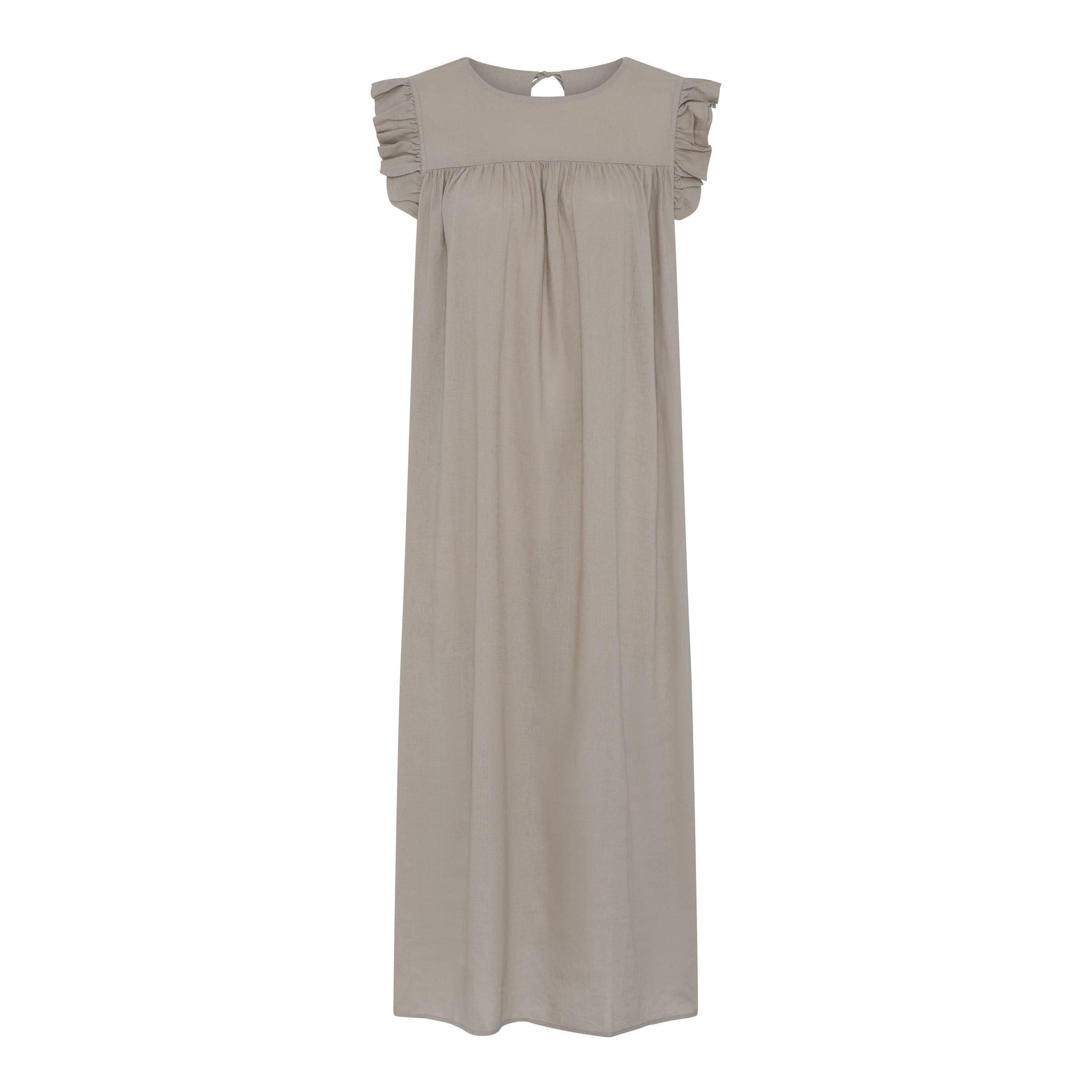 Den løse pasform og det lette materiale i hør og viskose gør kjolen behagelig at have på – selv på varme dage. Den runde hals og det enkle snit giver kjolen et elegant og afslappet look.