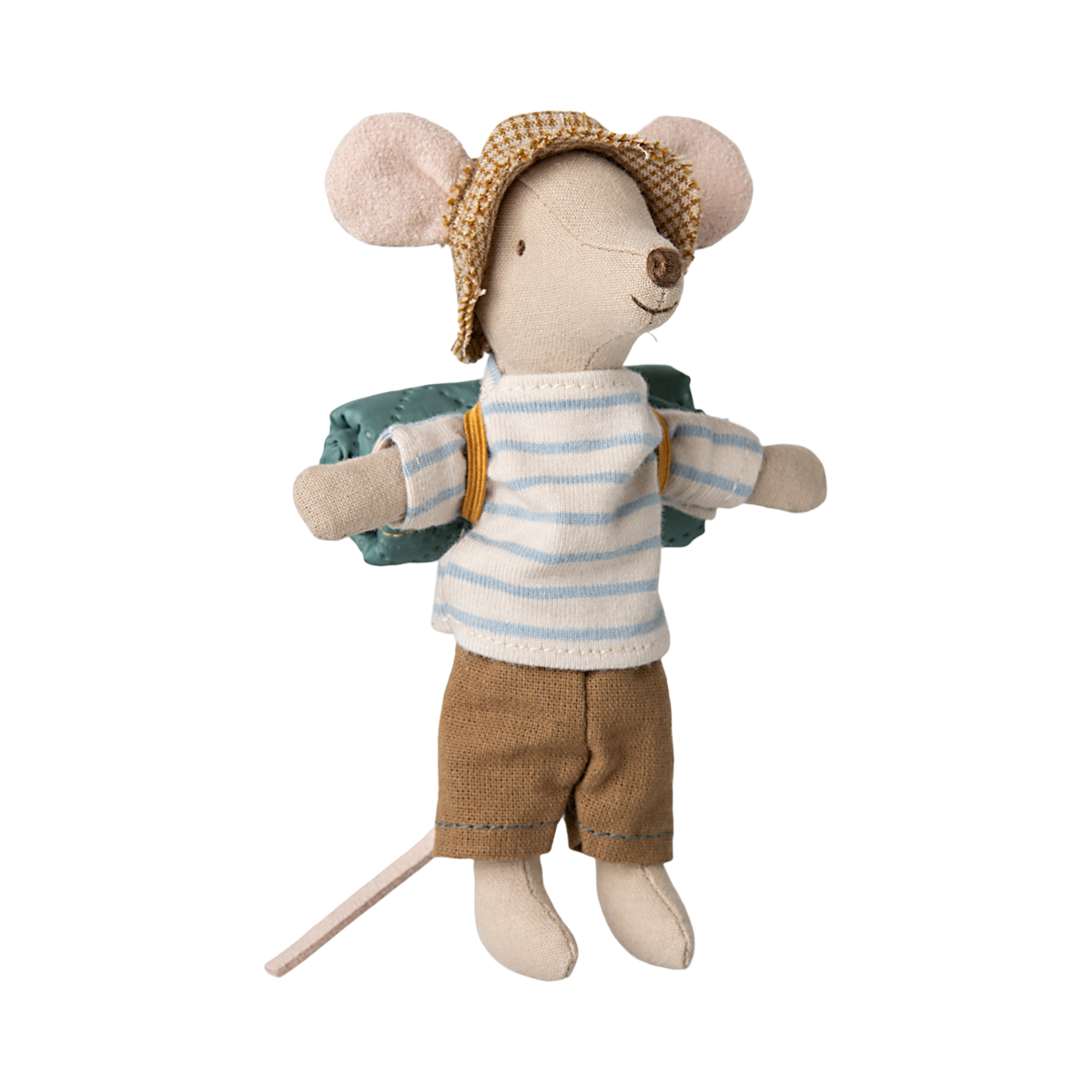 Hiker Mus Storbror fra Maileg er klar til nye eventyr i naturen. Han er klædt i praktisk tøj med fine striber og har altid sin sovepose med – rullet sammen som rygsæk på ryggen.