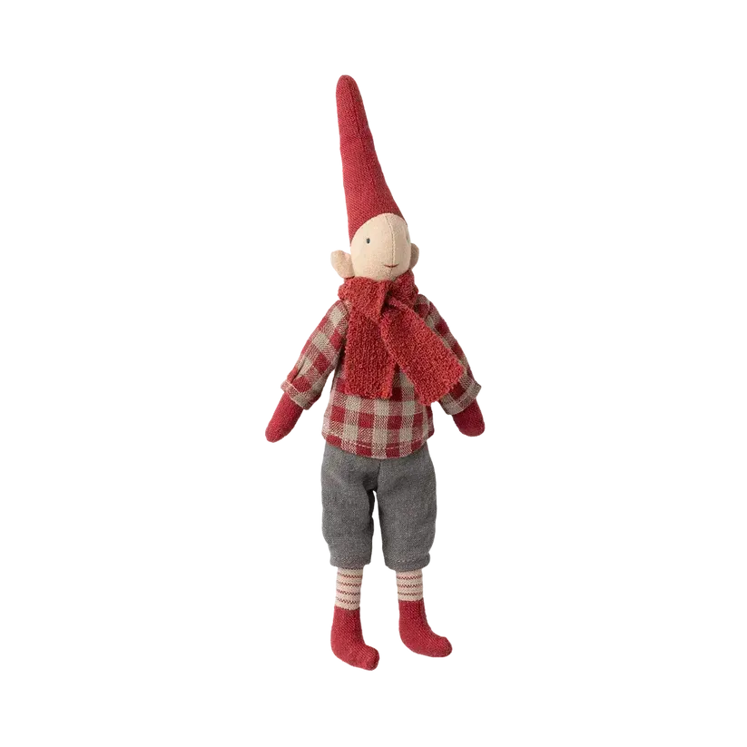 Denne nissedreng fra Maileg er en del af den populære nissekollektion og klædt i en klassisk rød ternet skjorte, der giver ham et charmerende og tidløst juleudtryk.