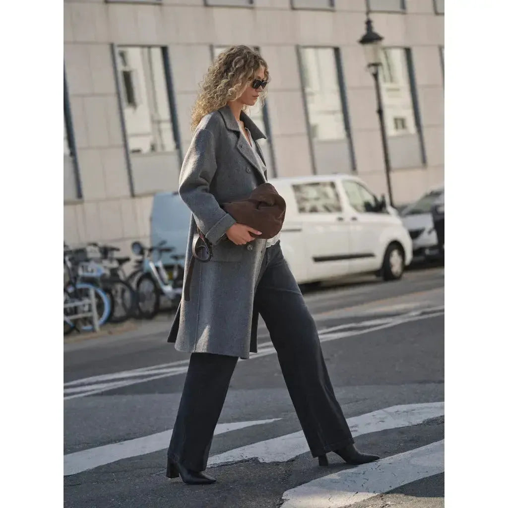 En elegant og klassisk frakke i lys gråbrun, der kombinerer varme og stil – oplagt til både byliv og lange gåture langs kysten.