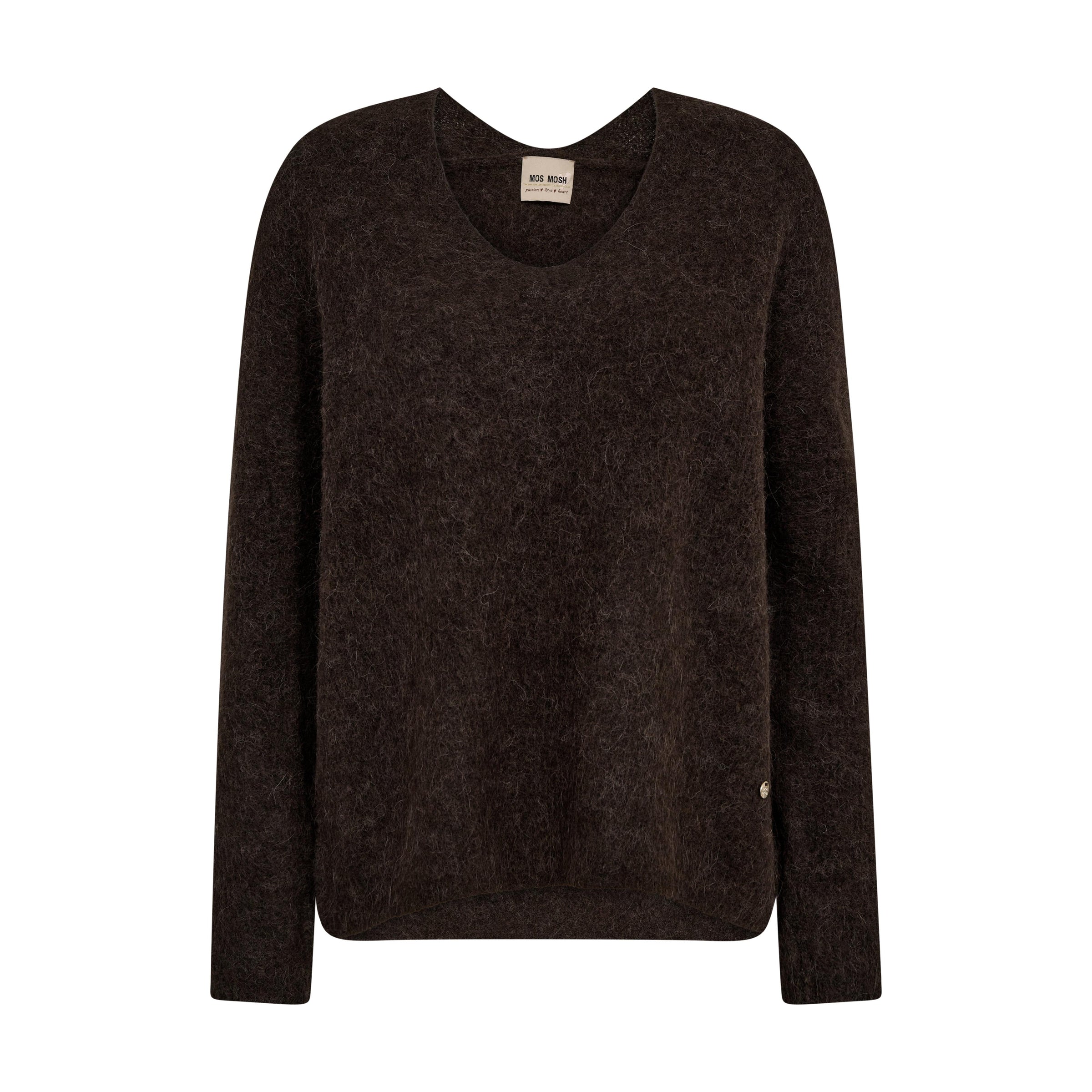 MMThora V-Neck Knit fra Mos Mosh er en enkel og elegant striktrøje med dyb v-udskæring og afslappet pasform. Farven Delicioso – en dyb, mørk brun – giver et sofistikeret og varmt udtryk, der passer perfekt til efterårets og vinterens garderobe.