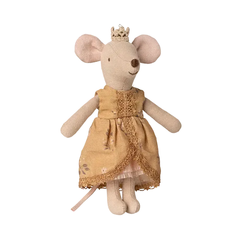 Denne charmerende prinsessemus fra Maileg er klædt i sin fineste kjole med smukke detaljer og bærer en gylden krone. Hun er lavet i storesøsterstørrelse og passer perfekt ind i Maileg-slottet.