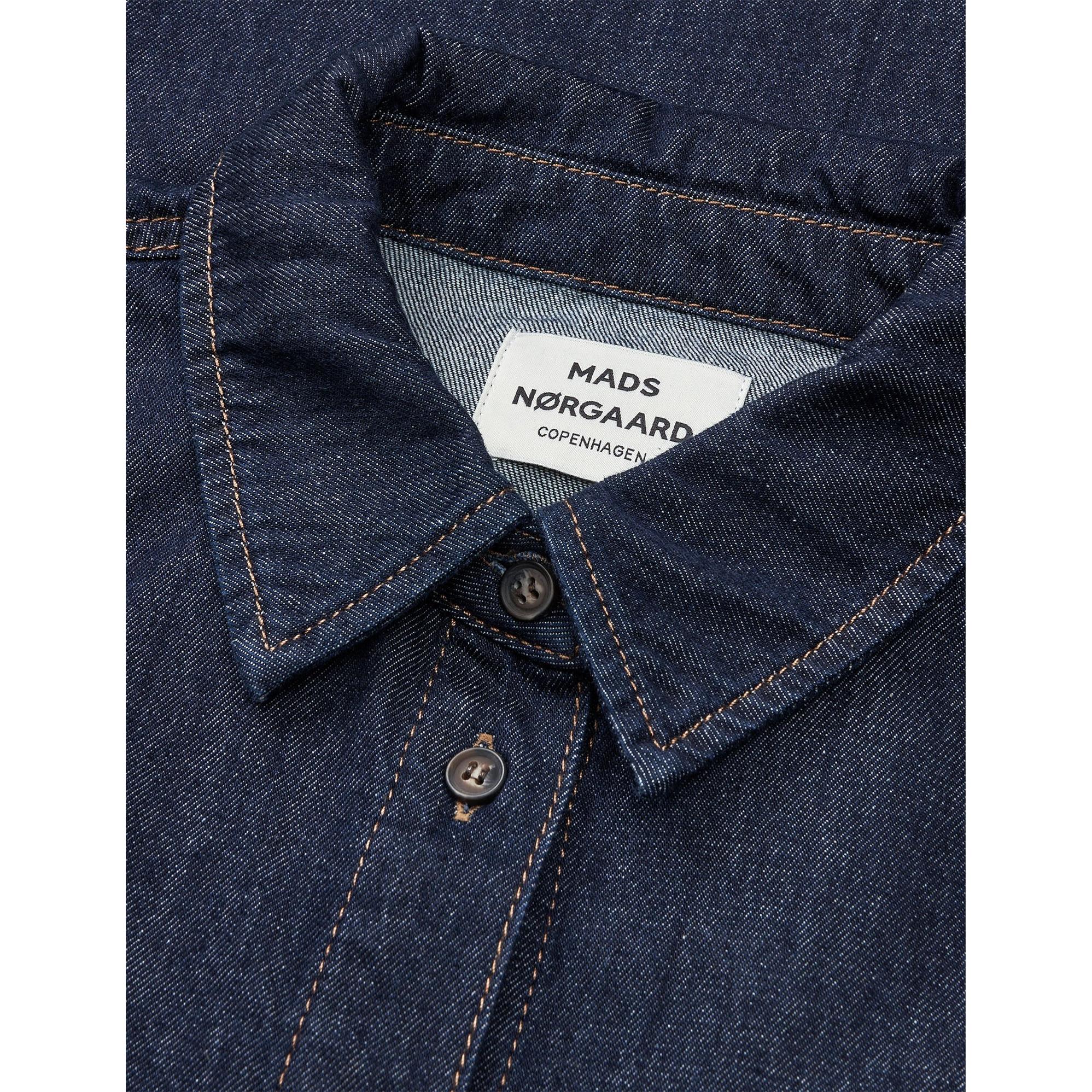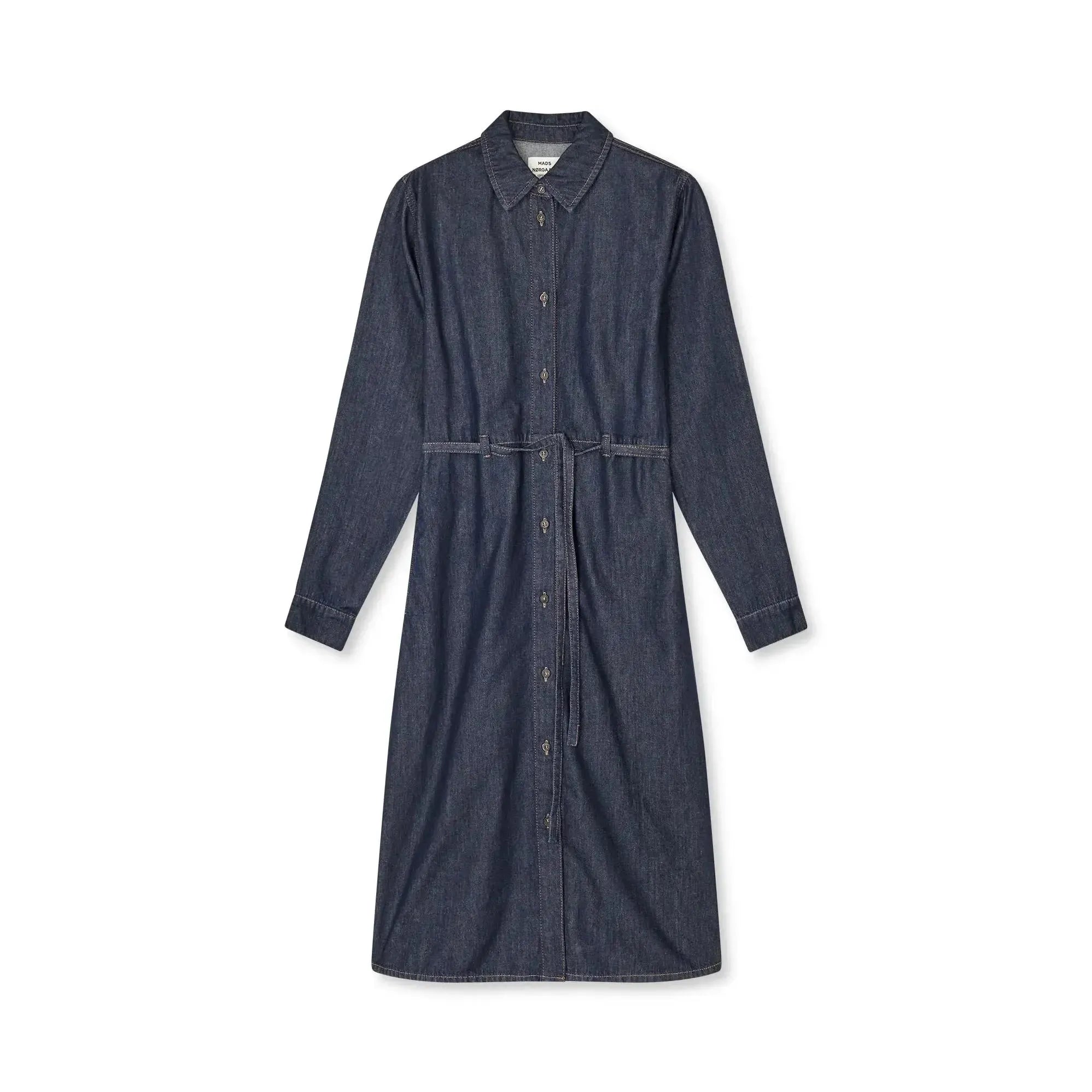 Cosy Denim Svanil Dress fra Mads Nørgaard er en afslappet og stilren skjortekjole i blødt, vasket denim. Den har en klassisk skjortekrave, lange ærmer og trykknapper hele vejen ned foran.