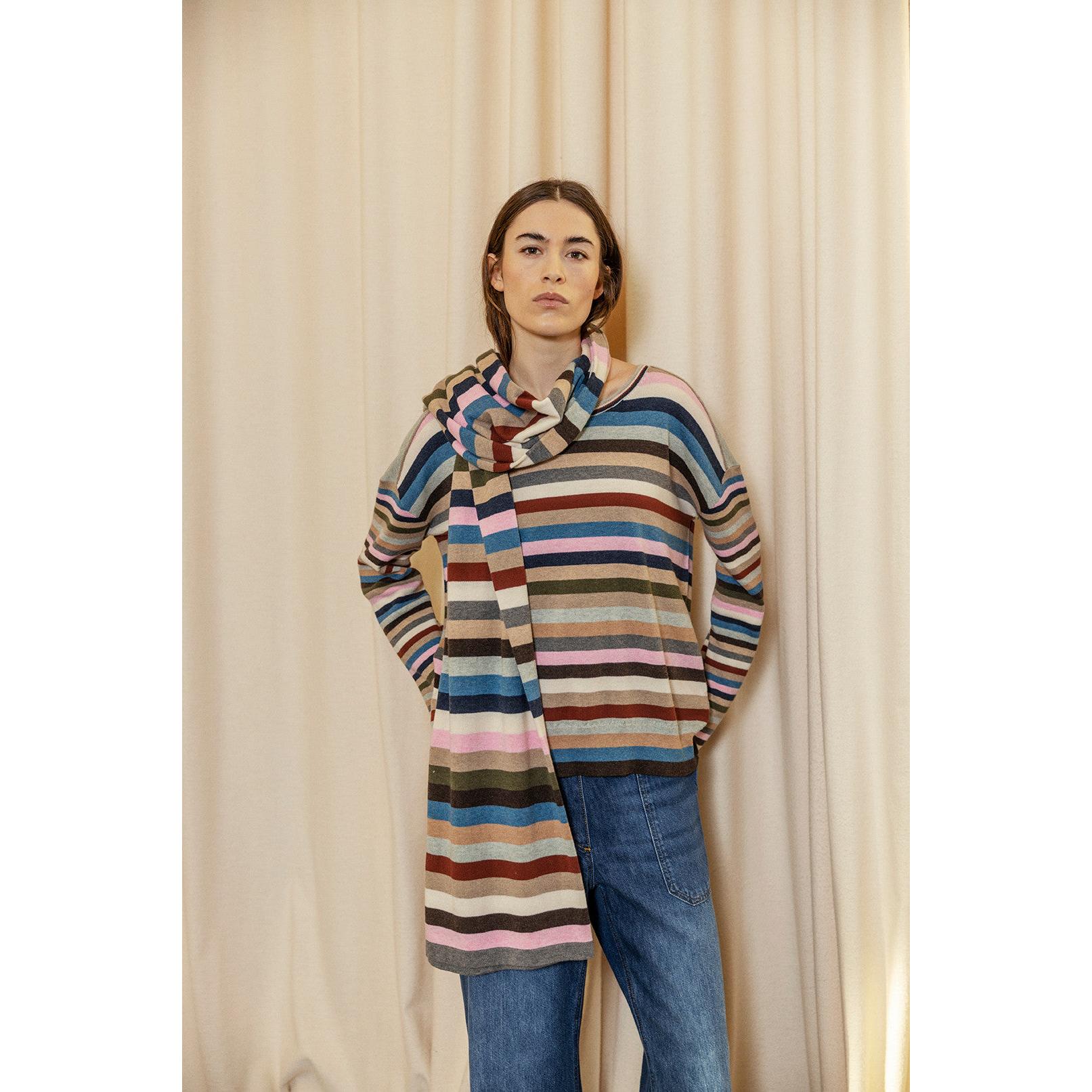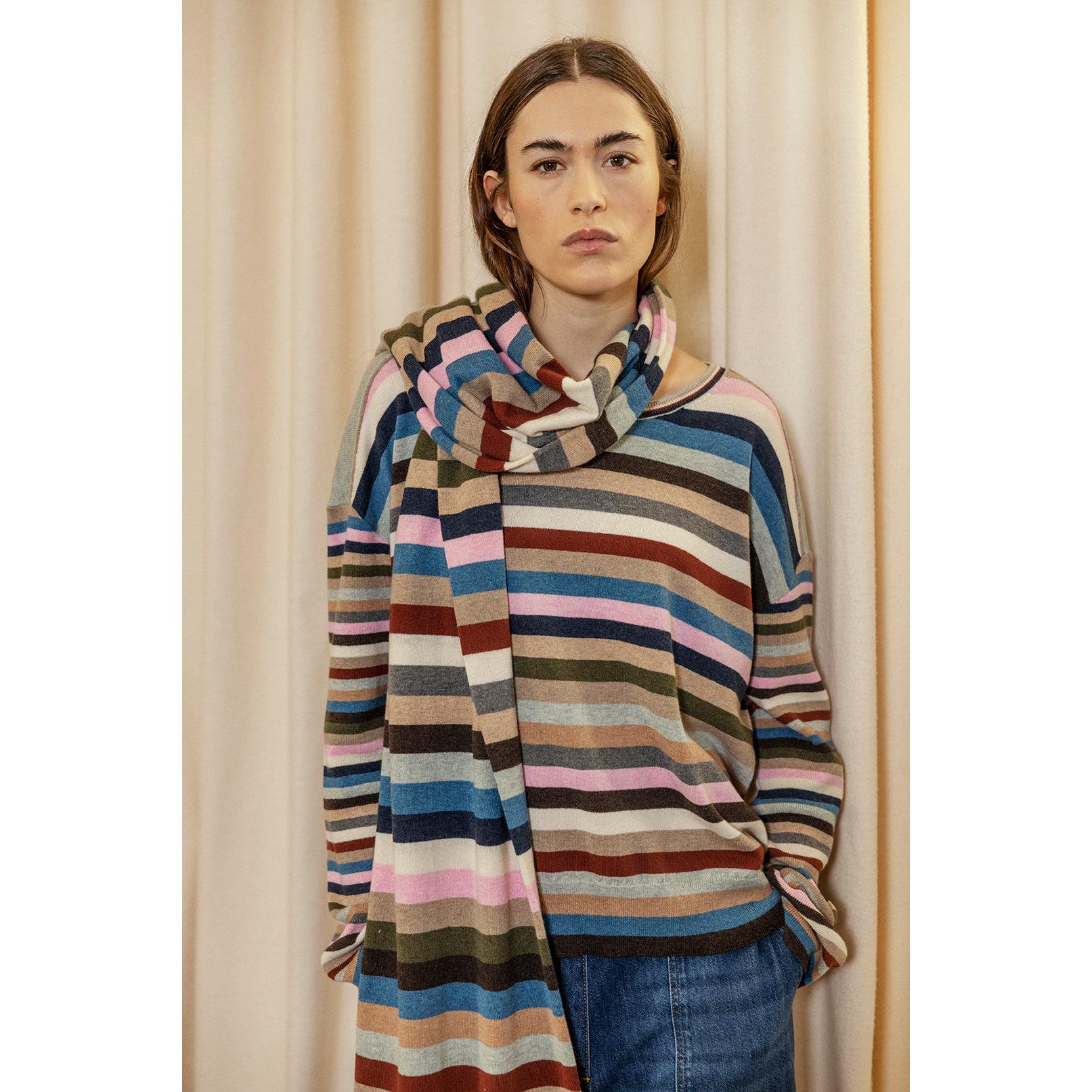 Farverne og striberne er de samme som i Safir-strikken, hvilket gør tørklædet perfekt som et sæt – men det kan også let bæres alene som farverigt indslag til en neutral frakke.