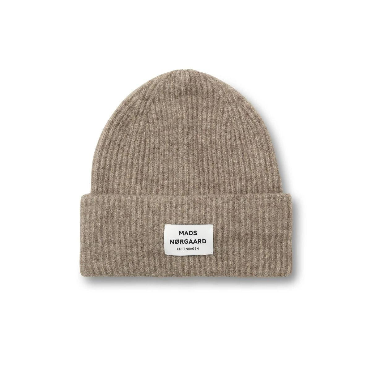 Tosca Anju Hat fra Mads Nørgaard er en klassisk, ribstrikket hue med opsmøg og diskret logomærke foran. Den varme beige nuance er både rolig og stilren – nem at kombinere med efterårs- og vintergarderoben.