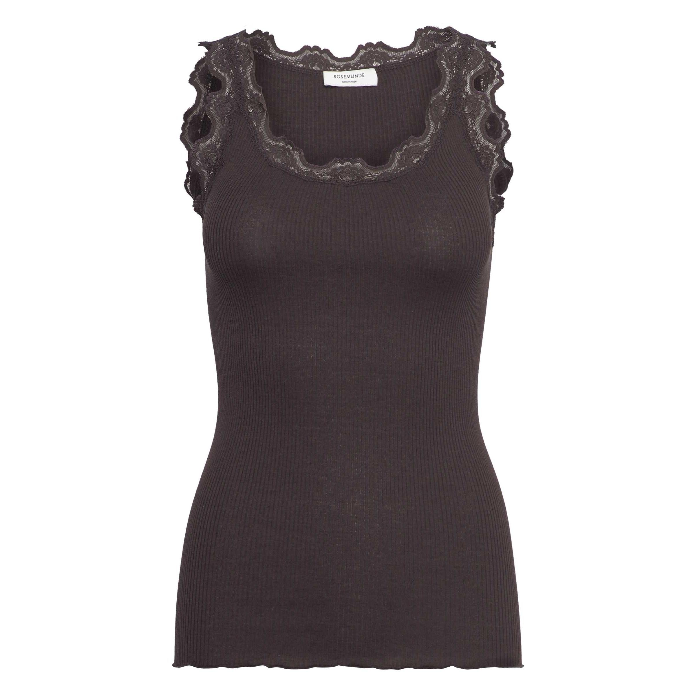 Toppen har smalle stropper, en lang pasform og en dekorativ blondekant forneden, som tilføjer et feminint touch. Den runde halsudskæring giver et klassisk og anvendeligt look – ideel både alene og under andet tøj.