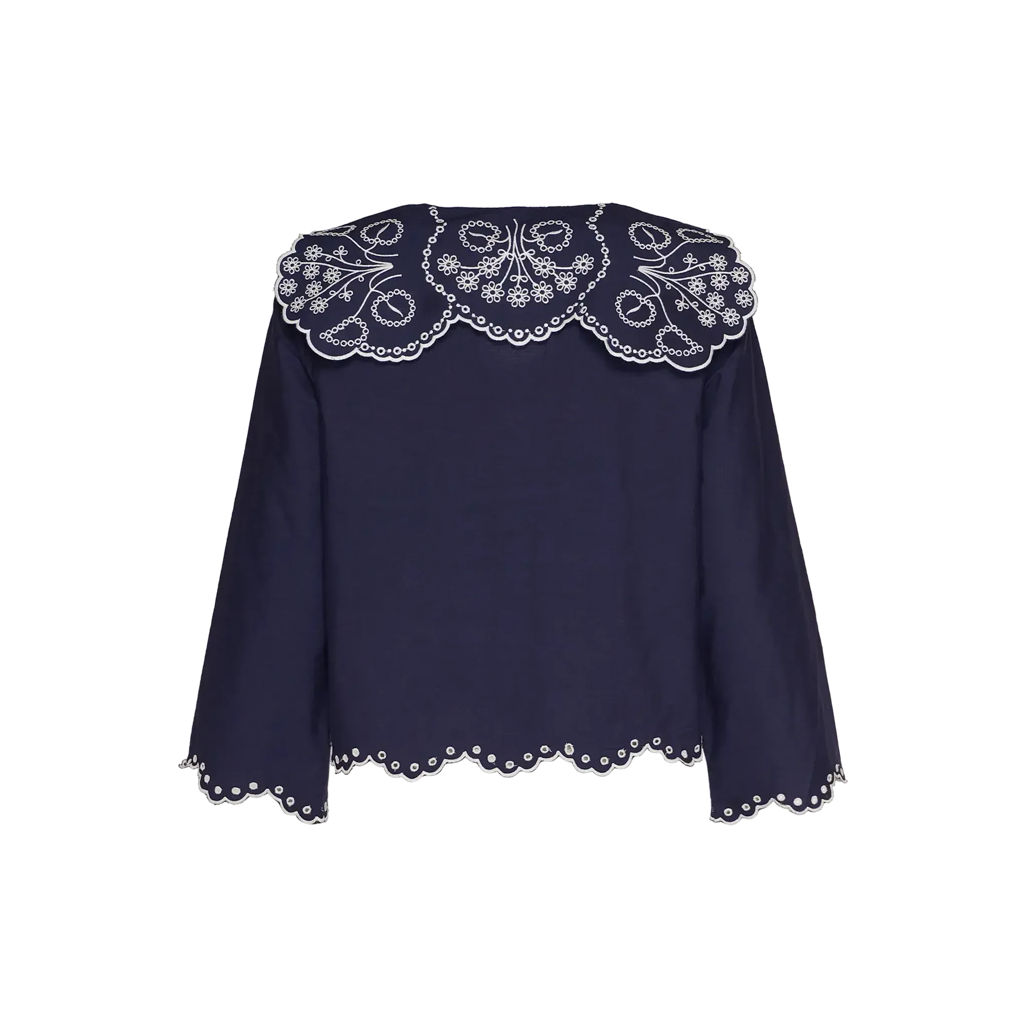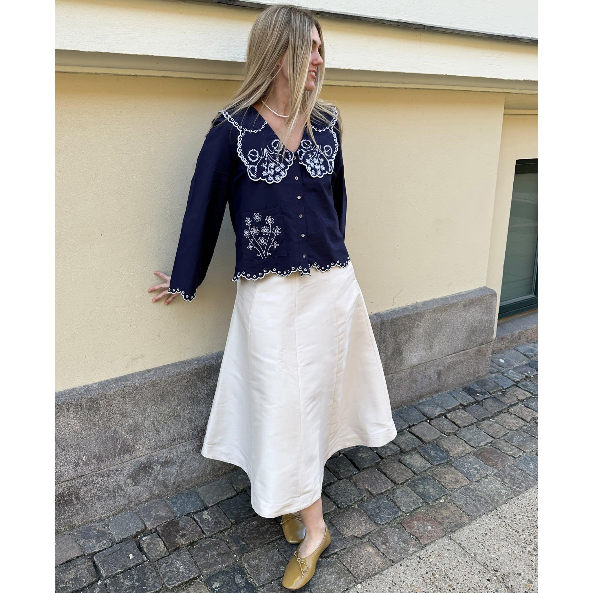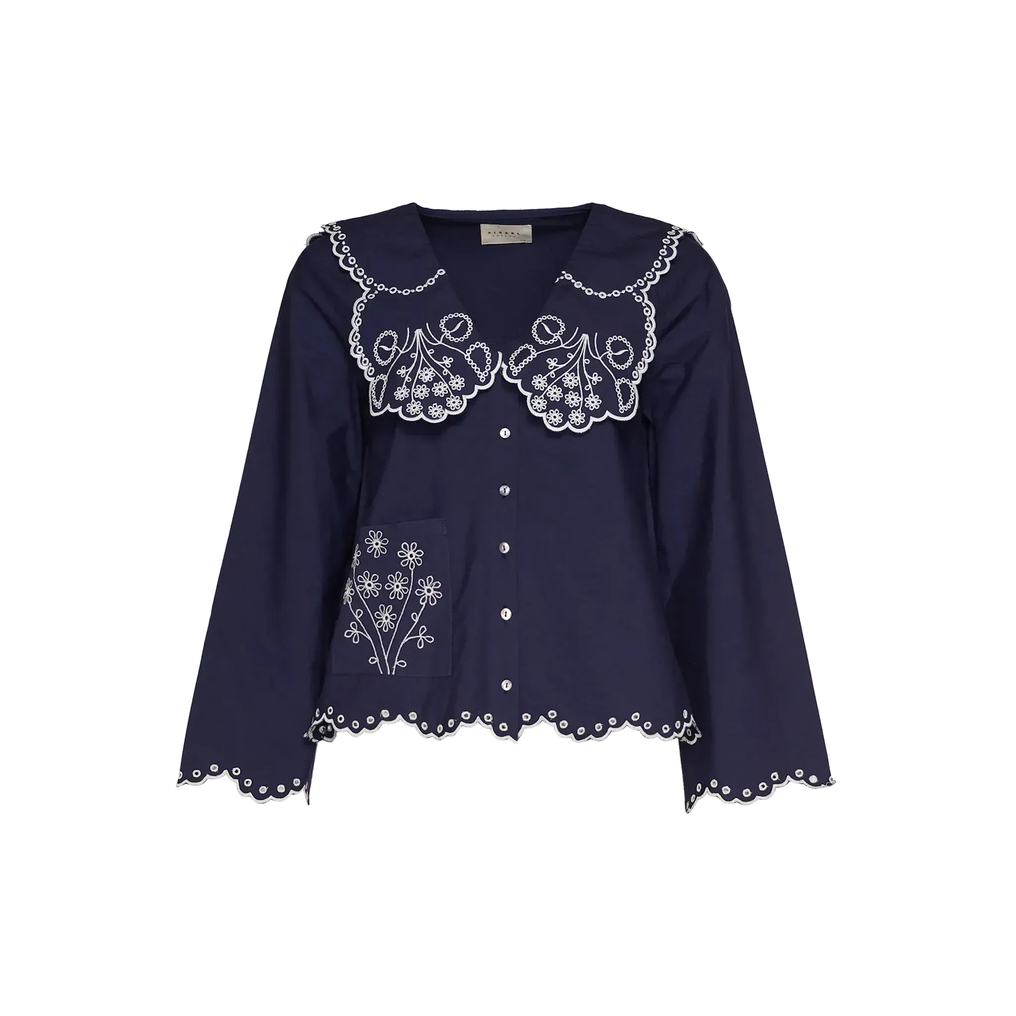 Elysia Shirt fra Sissel Edelbo er en let og romantisk skjorte i navyblå økologisk bomuld. Det oversized kravesnit og de håndværksinspirerede broderier giver skjorten et særligt, vintagepræget udtryk.