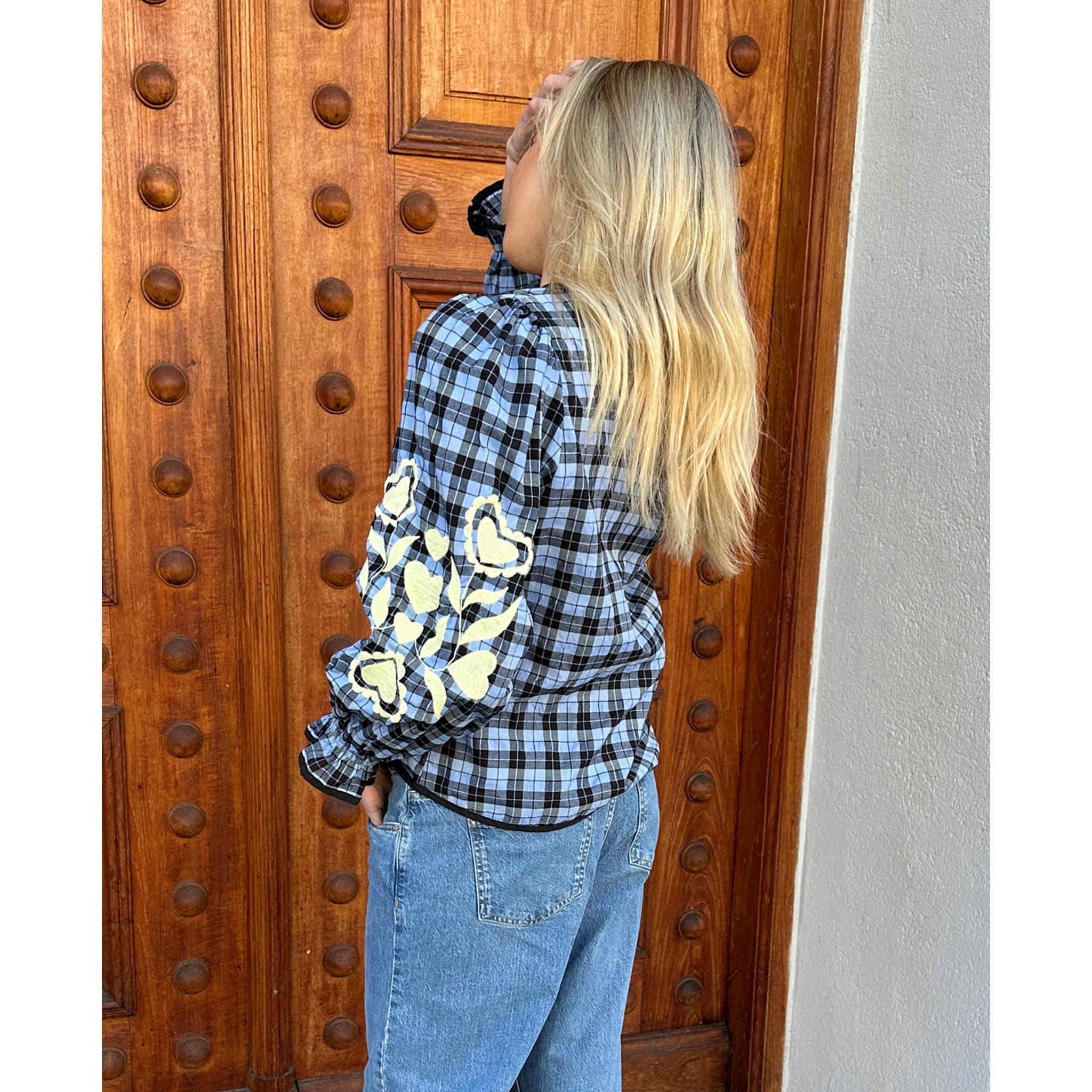 En karakterfuld top med broderier og blå tern – til sommerdage, hvor det enkle godt må have lidt kant og personlighed.