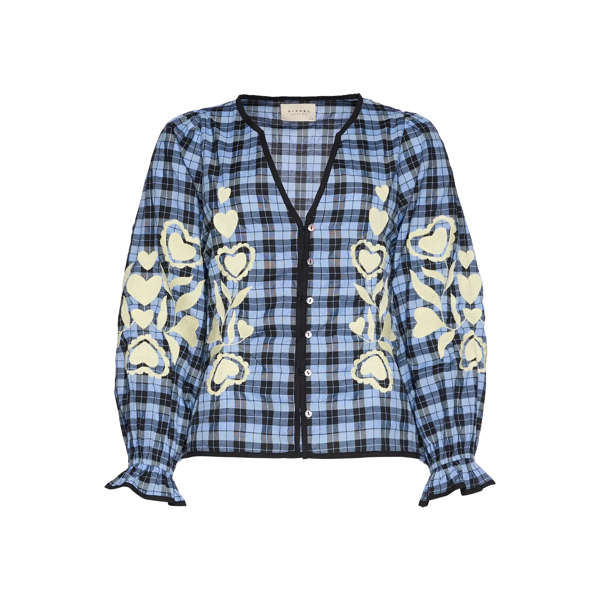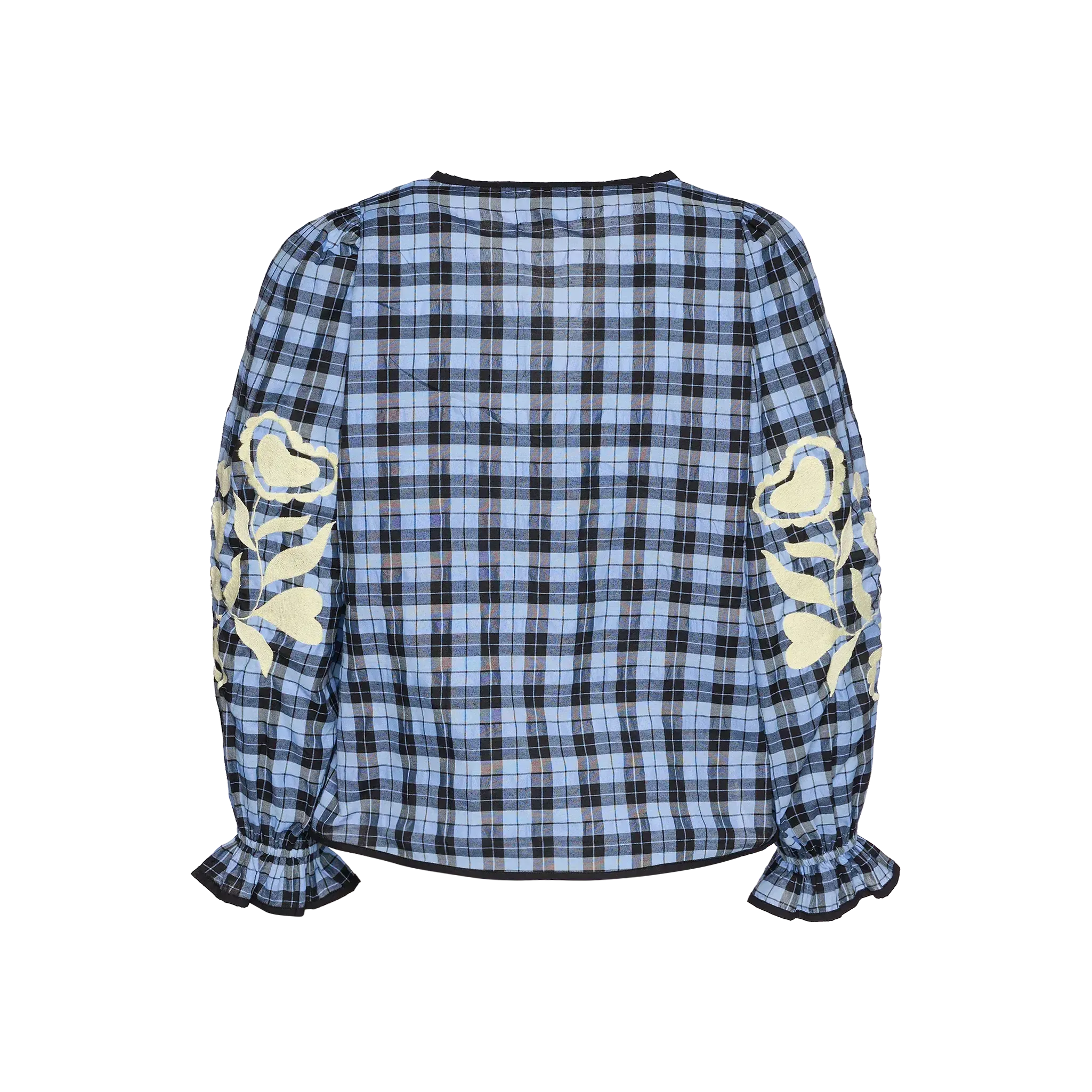 Toppen har lange ærmer med rynk og elastik ved håndleddet, som afsluttes med en lille flæse. De gule broderier med hjerteformede blomster giver toppen sit karakteristiske udtryk og tilfører en legende og håndlavet detalje.