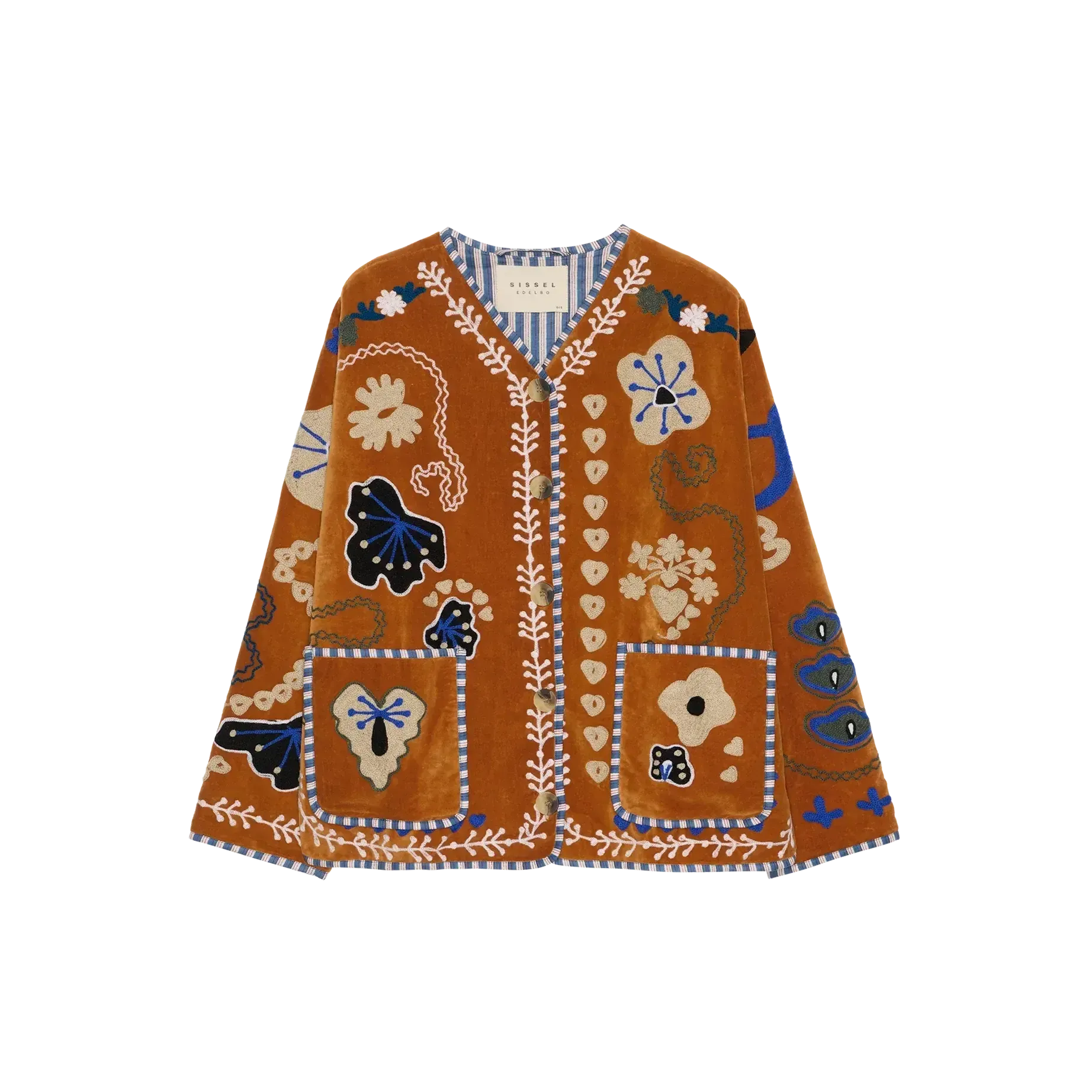 Maggie Jacket fra Sissel Edelbo i farven Velvet Brown er en karakterfuld jakke i blød bomuldsfløjl med farverigt Suzani-broderi. Den dybe brune tone og de broderede blomster og hjerter giver et unikt, boheme-inspireret udtryk, som skiller sig smukt ud i garderoben.