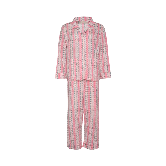 Nuit Pyjamas Set er et smukt todelt sæt i 100 % økologisk bomuld med traditionelle indiske blokprint. Pyjamasskjorten har lange ærmer, en lille krave med afrundede hjørner og piping i samme stof – en klassisk og komfortabel model i afslappet snit.