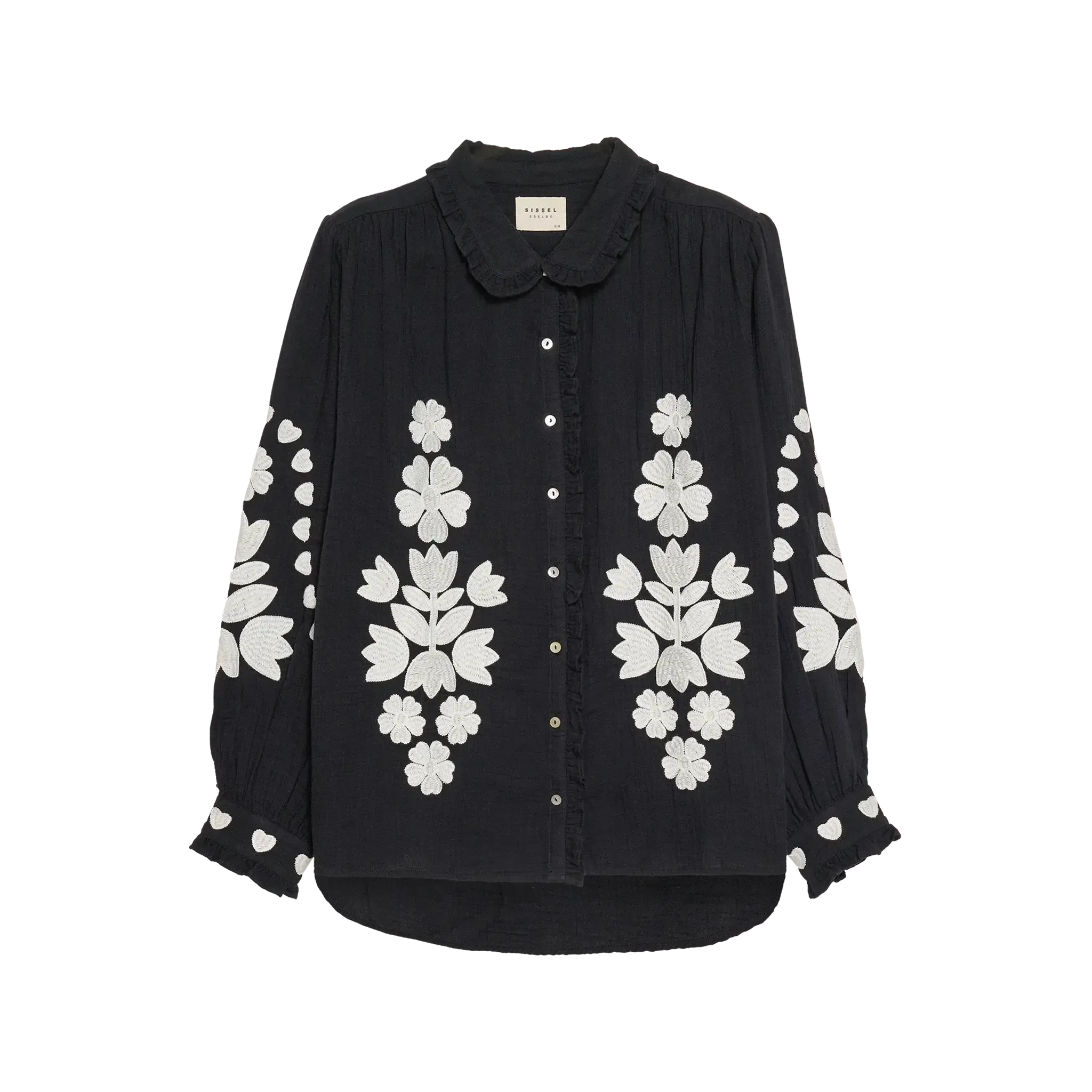 Rae Shirt fra Sissel Edelbo er en sort skjorte i økologisk bomuld med broderede detaljer og et løst, feminint snit. Den har små læg og rynk, som skaber volumen, og et eksklusivt udtryk med sorte tone-i-tone broderier.