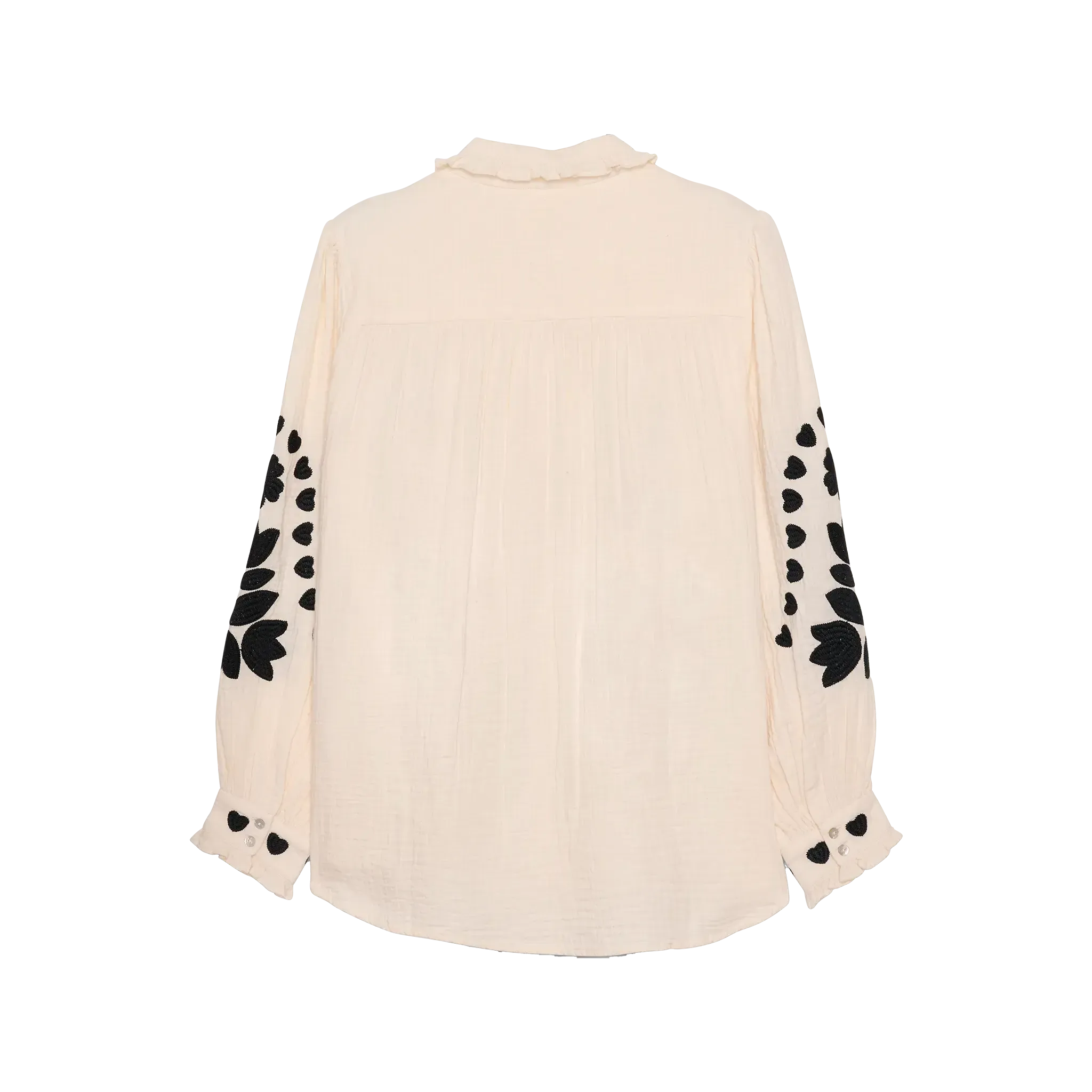 Langs forsiden er skjorten dekoreret med broderi i kontrastfarve. Motiverne forestiller blomster og hjerter i en grafisk streg, der tilfører personlighed og kant til det ellers bløde design.
