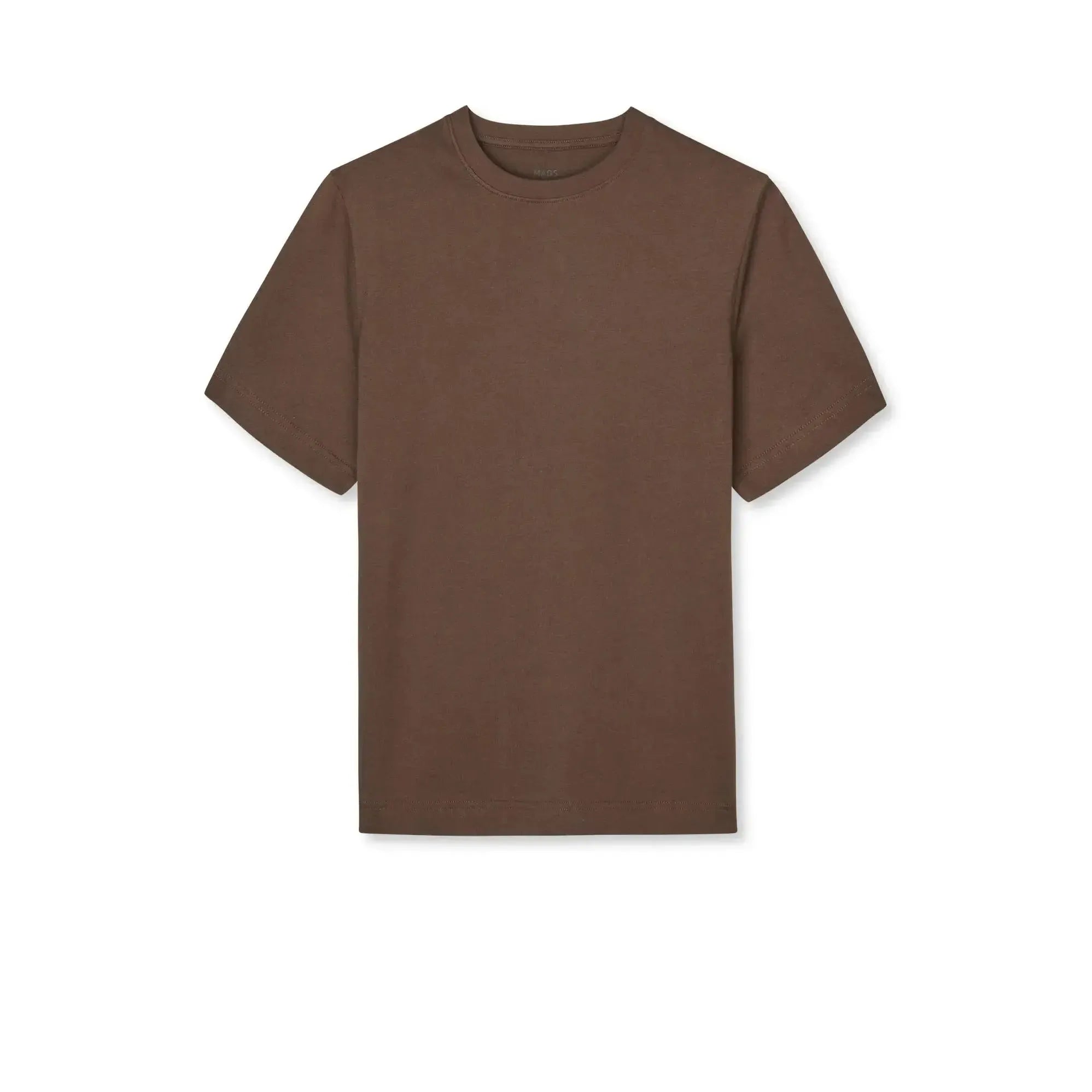 T-shirten har et lige snit og et rent udtryk uden forstyrrende detaljer. Den mørkebrune farve giver et roligt og stilfuldt look, der passer perfekt ind i basisgarderoben.