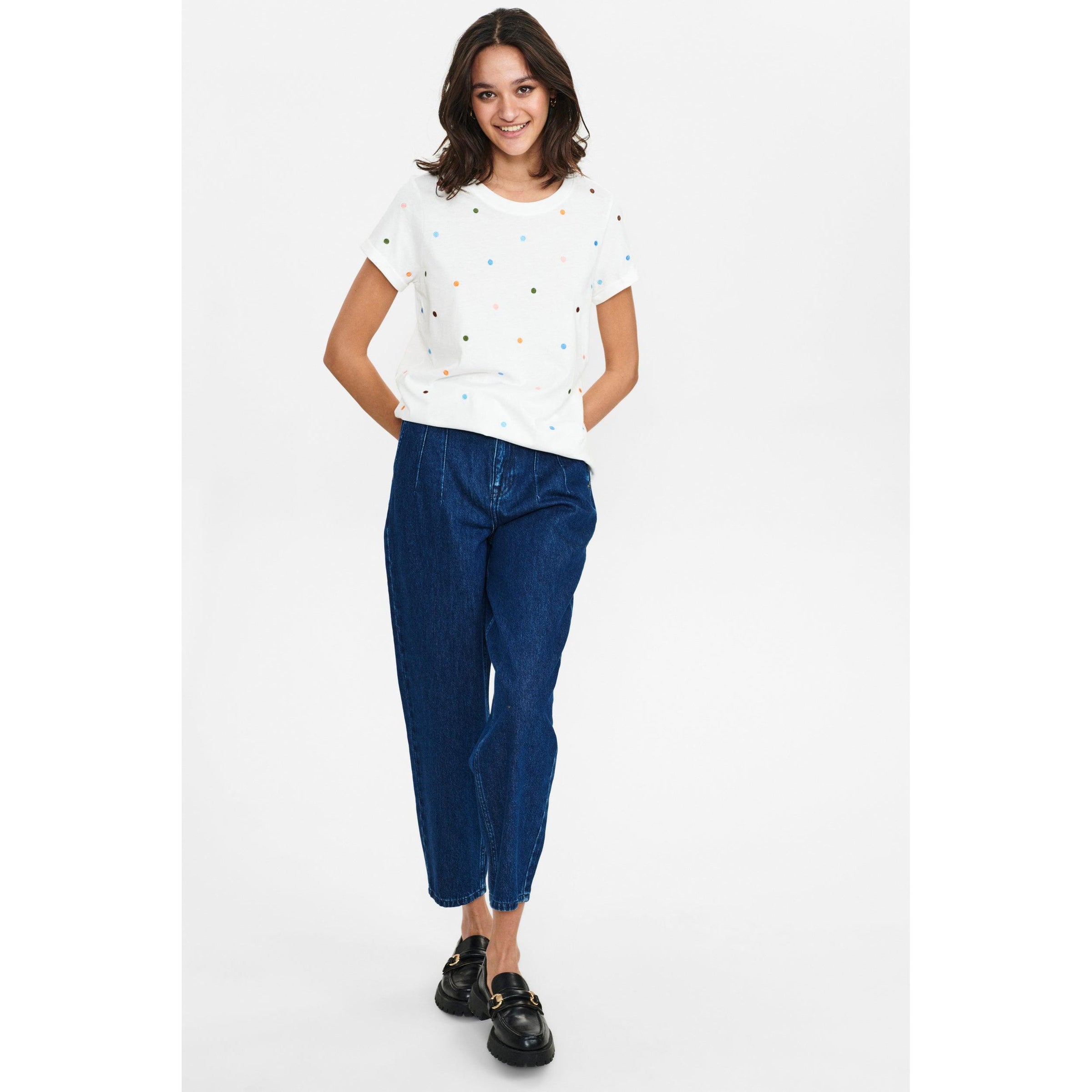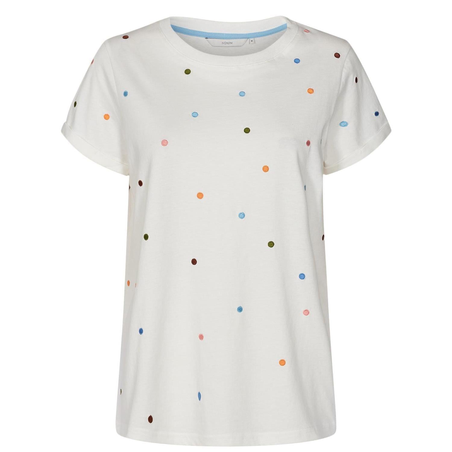 Nubrennan T-shirt fra Nümph er en klassisk hvid t-shirt i blød bomuld med broderede prikker i flere farver. Et legende design med et enkelt snit, der passer til både hverdag og afslappede stunder.