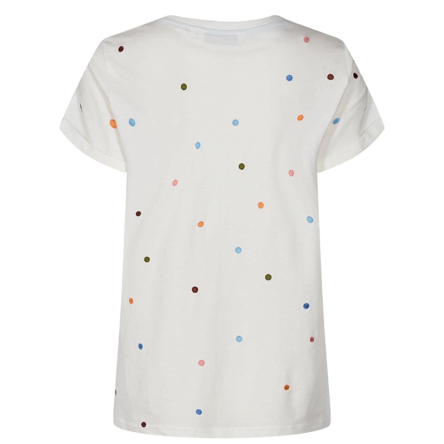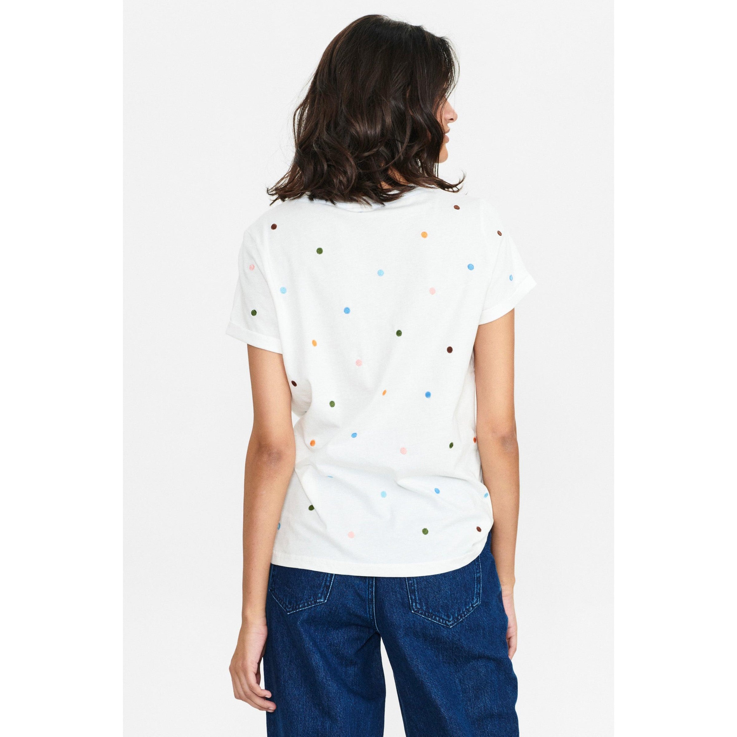 T-shirten har rund hals, korte ærmer med opsmøg og en let løs pasform. De små broderede prikker i blå, rosa, brun, orange og grøn giver et personligt udtryk, mens den rene base holder det hele roligt og anvendeligt.