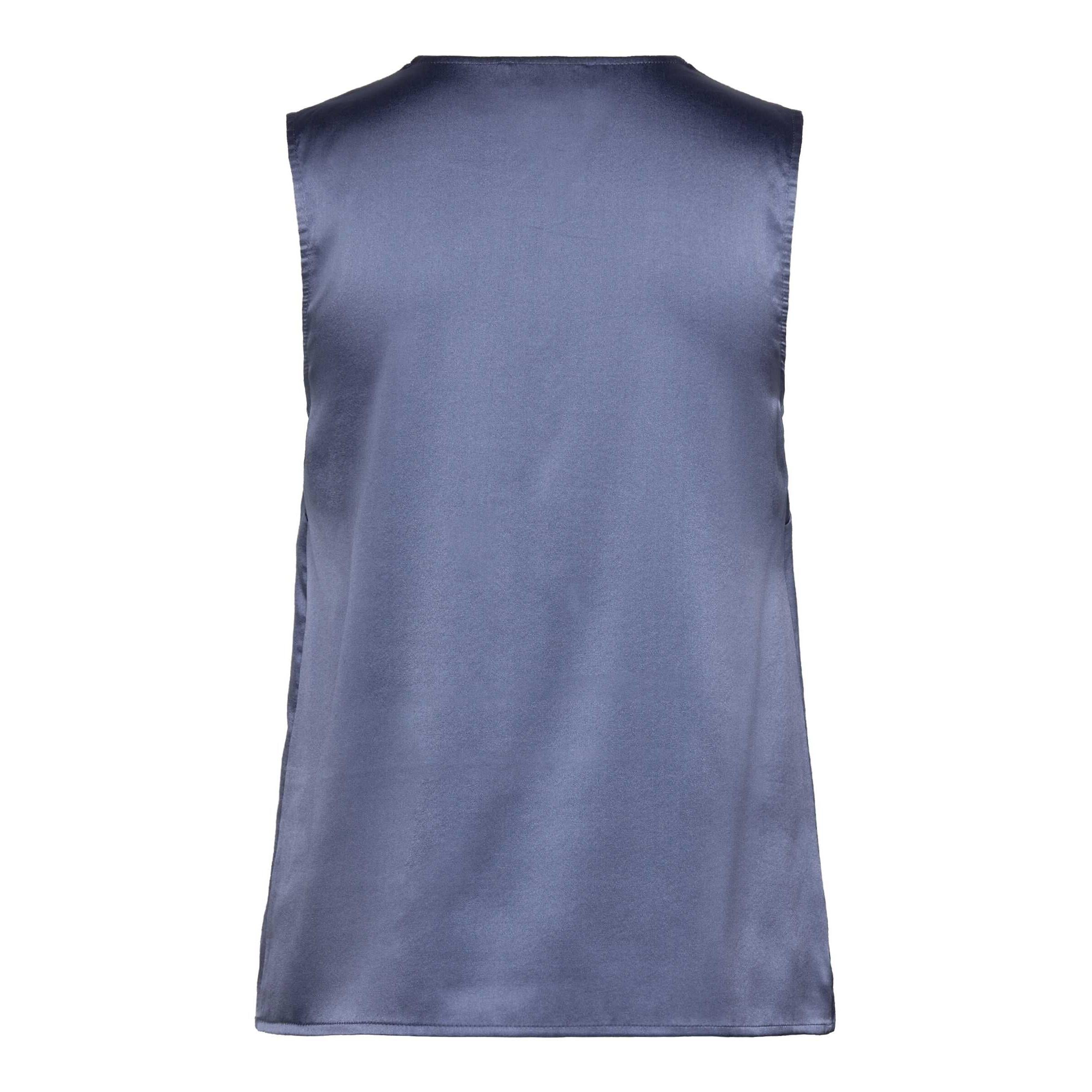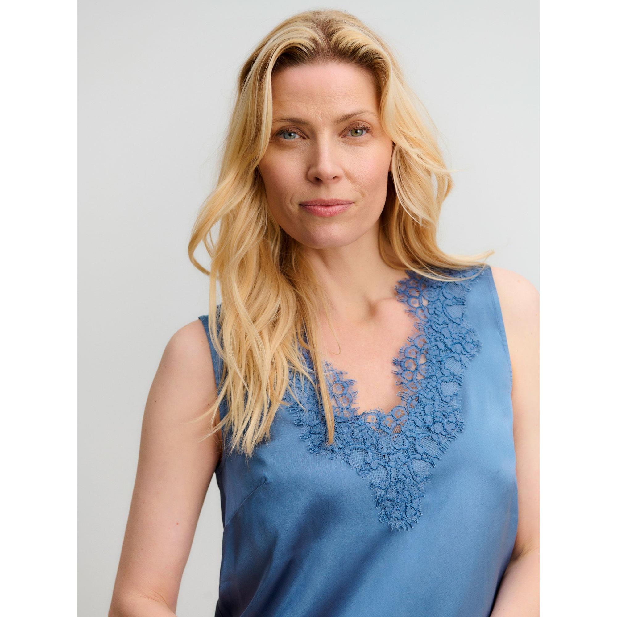Toppen har V-udskæring med fine blonder foran og bagpå, hvilket giver et feminint udtryk. Den silkebløde kvalitet gør den behagelig at have på – både alene og under en cardigan eller blazer.