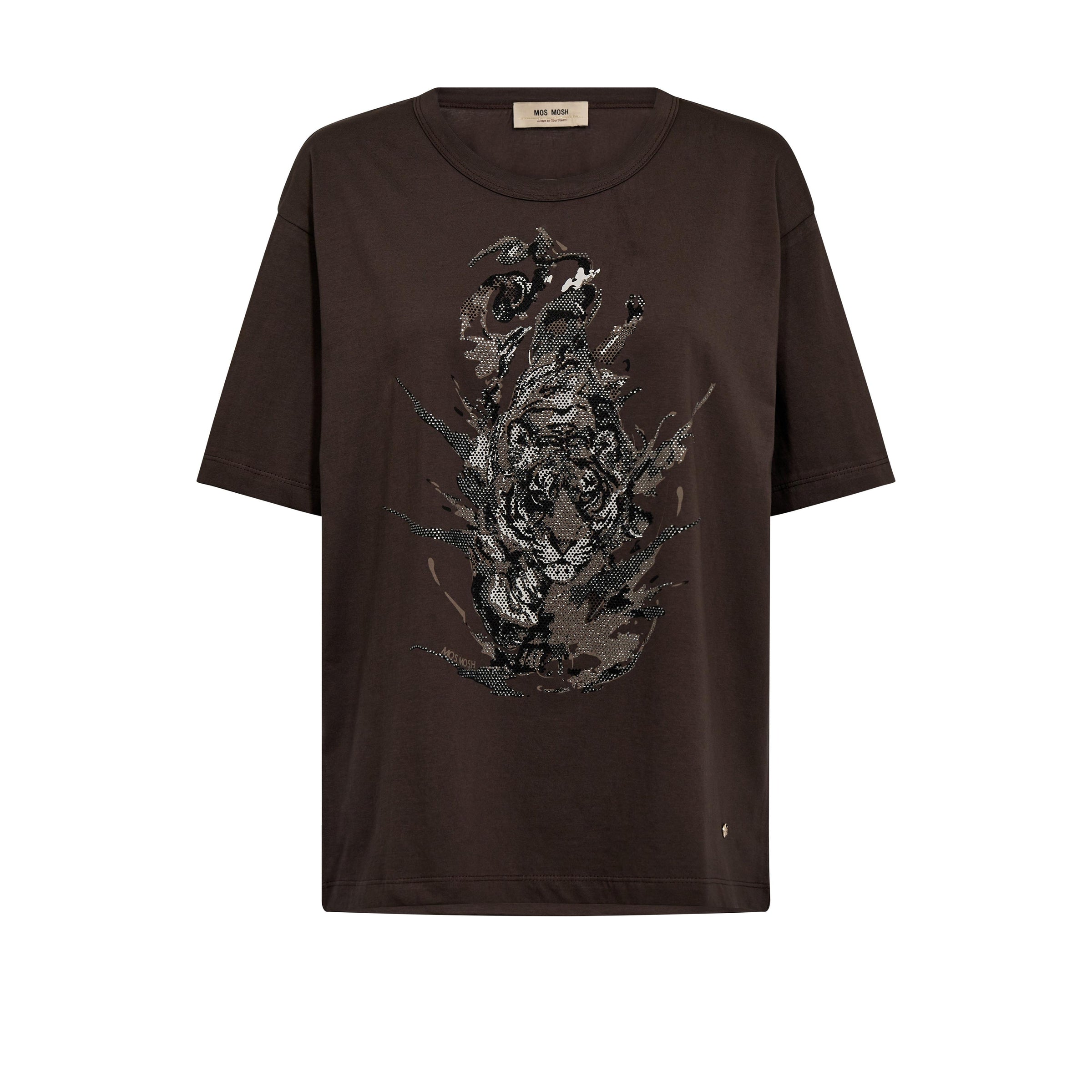 MMCorlett O-SS Tee fra Mos Mosh er en mørk brun T-shirt med et markant frontprint og små, skinnende sten, der giver et iøjnefaldende udtryk. Motivet har et kunstnerisk og råt udtryk, som tilføjer kant til den ellers klassiske silhuet.